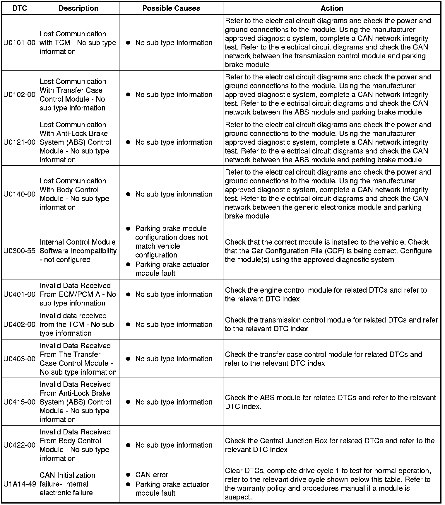 The table below lists all Diagnostic Trouble Codes (DTCs) that could be logged in the Parking Brake Module, for additional Diagnosis and Testing information refer to the relevant Diagnosis and Testing Section. For additional information, refer to Parking Brake Initial Inspection and Diagnostic Overview