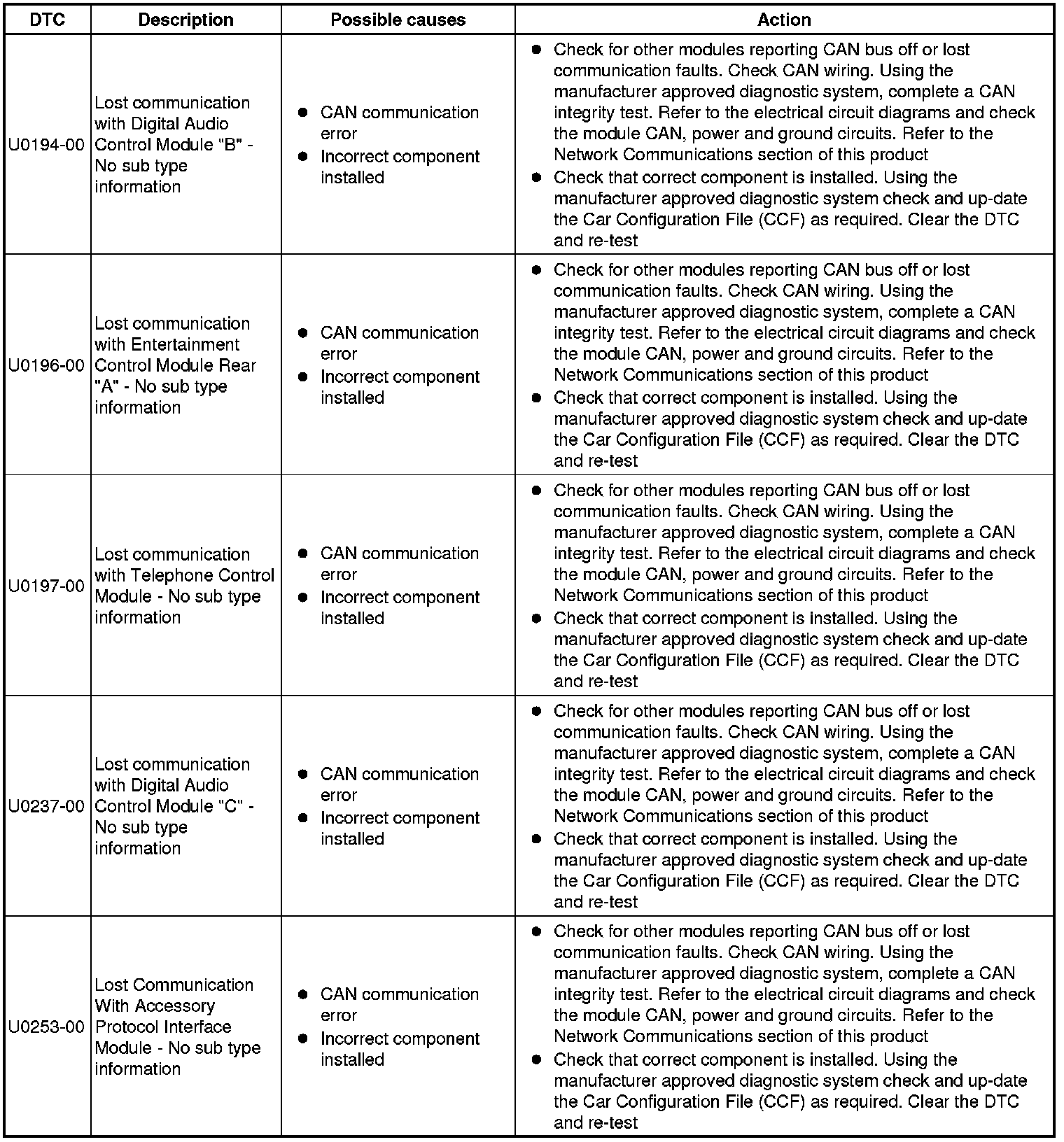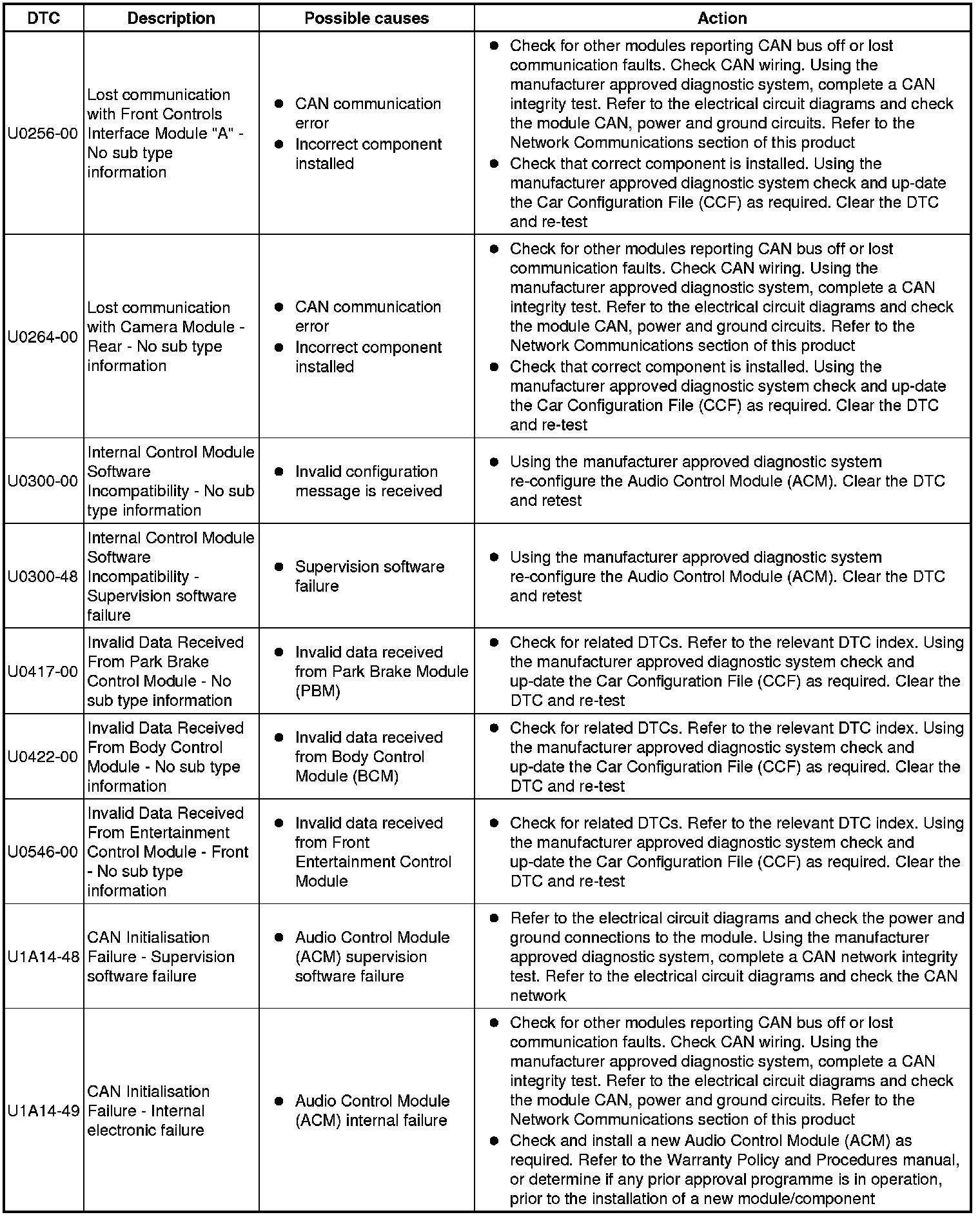 The table below lists all Diagnostic Trouble Codes (DTCs) that could be logged in the Audio Control Module, for additional Diagnosis and Testing information refer to the relevant Diagnosis and Testing Section. For additional information, refer to Information and Entertainment System Information and Entertainment System