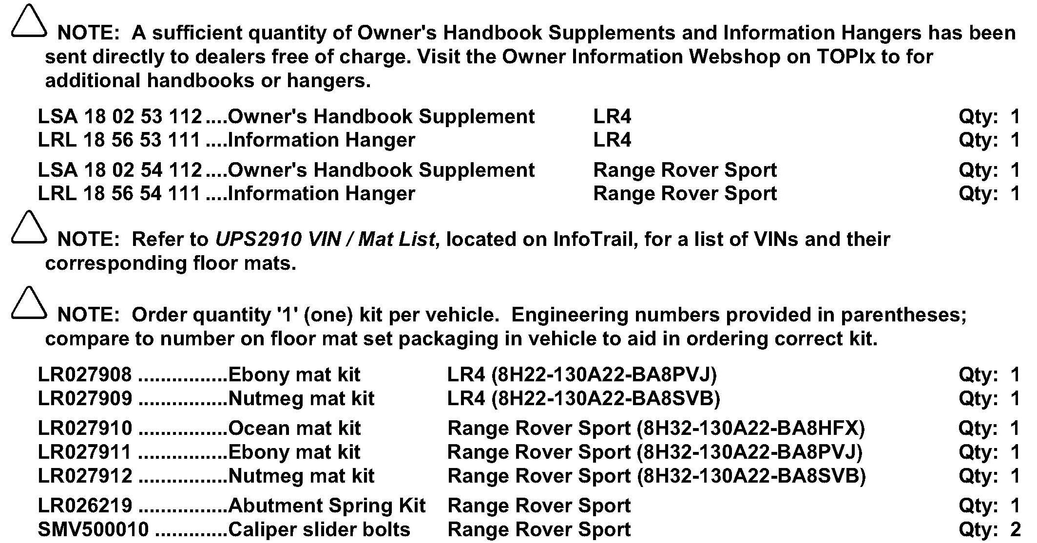 1. Place updated Owners Handbook Supplement (LSA 18 02 53 112 - LR4; LSA 18 02 54 112 - Range Rover Sport) in the vehicle.