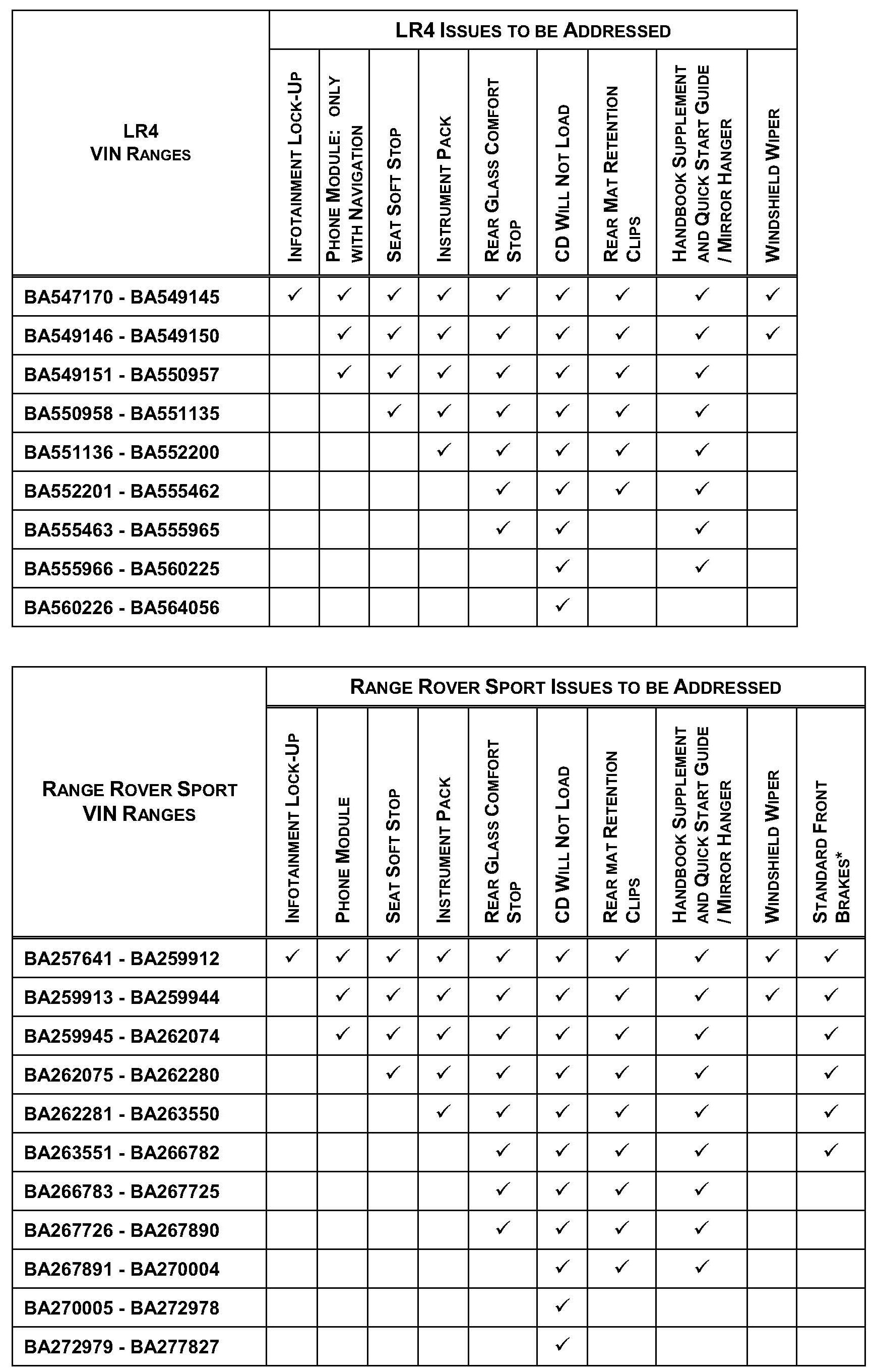 To ensure 2011 model year LR4 and Range Rover Sport vehicles are equipped with the very latest software and parts to enhance the ownership experience, a limited number of vehicles within the affected VIN range require a number of software updates and parts.