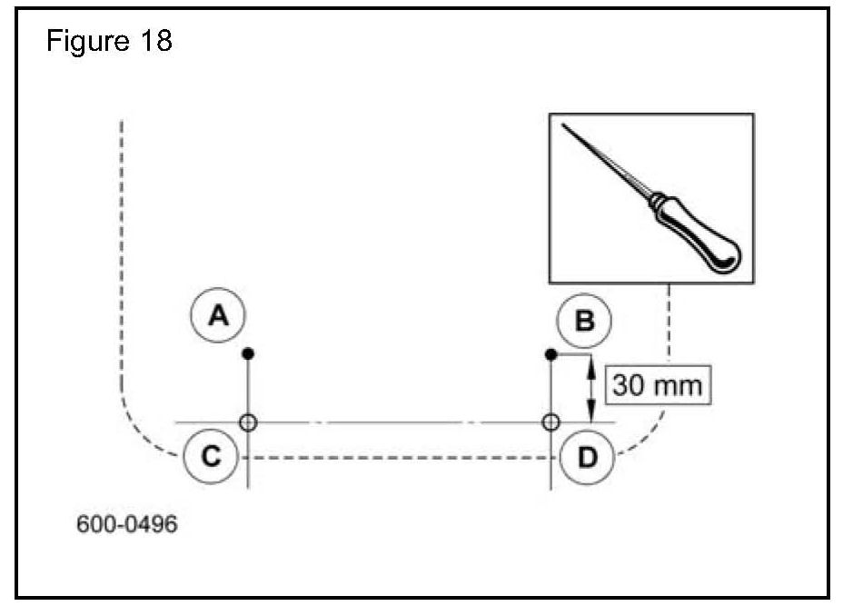 5. Use a suitable tool to spike a small hole in the vehicle carpet at points 'C' and 'D', 30mm rearwards of marks 'A' and 'B'. (Figure 18)