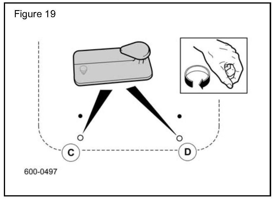 6. Insert the mat retention clips into points 'C' and 'D' in the vehicle carpet, rotating clockwise until they turn freely. (Figure 19)
