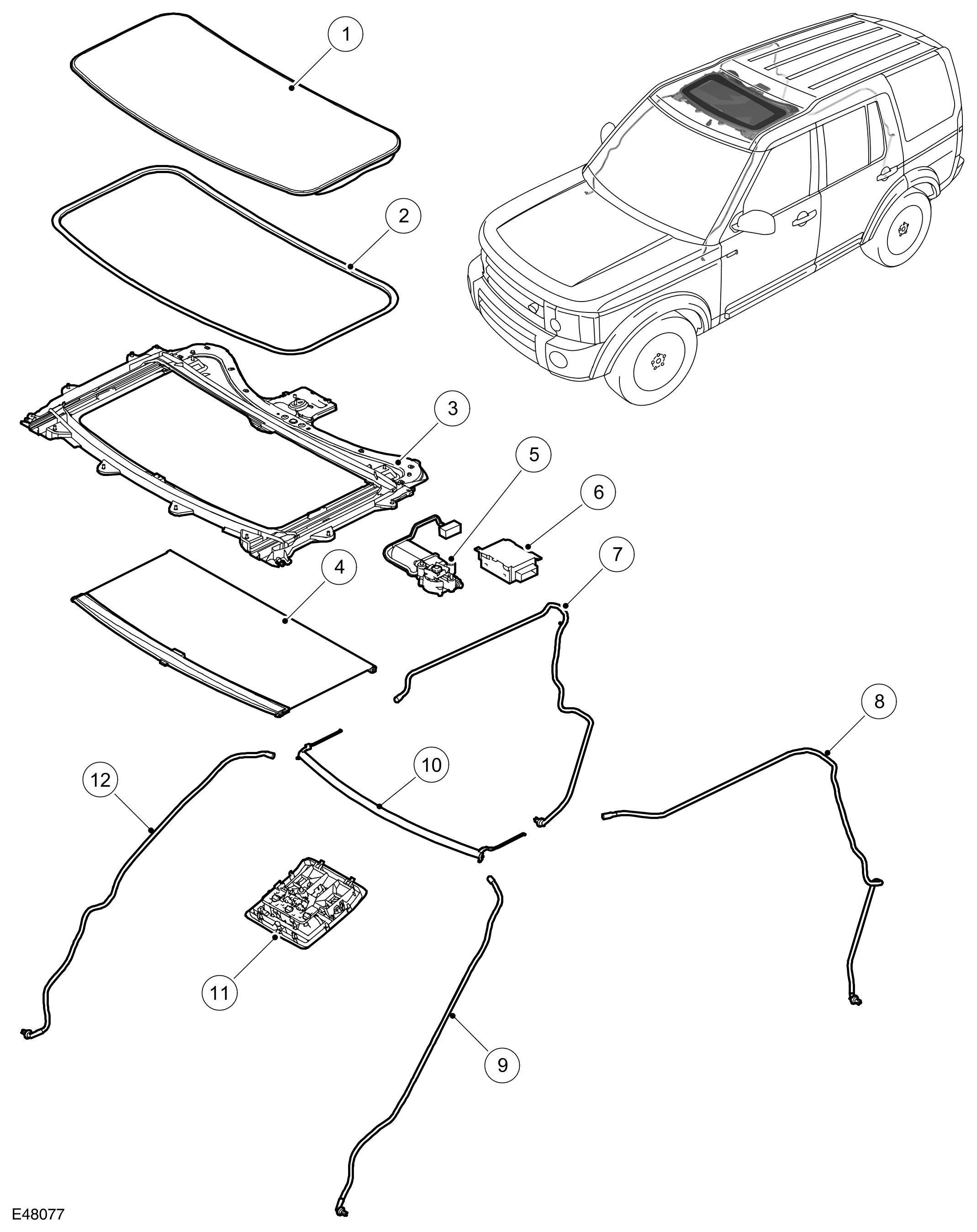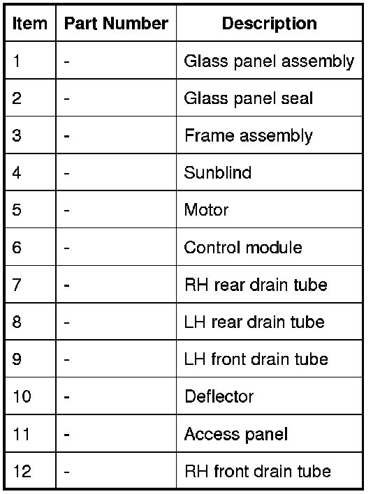 The sunroof is electrically operated through a two-way rocker switch located on the roof mounted centre console. An electric motor, attached to the sunroof frame, drives the glass sunroof panel to the tilt or open positions. The glass panel is operated by two cables, which are driven by the motor.