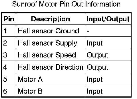 The motor contains a micro-switch and a Hall effect sensor. Two gears, driven by the motor at one end of the pinion drive spindle, trip the micro-switch every thirteen revolutions of the spindle. When the micro-switch is tripped, the sunroof control module senses an open circuit signal. The sunroof control module, to calculate the exact position of the sunroof, uses the signal from the micro-switch combined with signals received from the Hall effect sensor. The Hall effect sensor is also responsible for the operation of the anti-trap function.