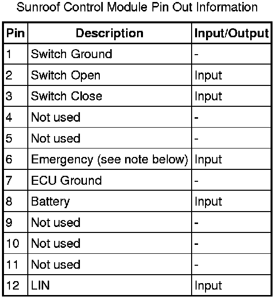 The sunroof control module will remain awake and enabled until pin 6 is disconnected again. Under no circumstances is this pin to be left grounded for long periods.