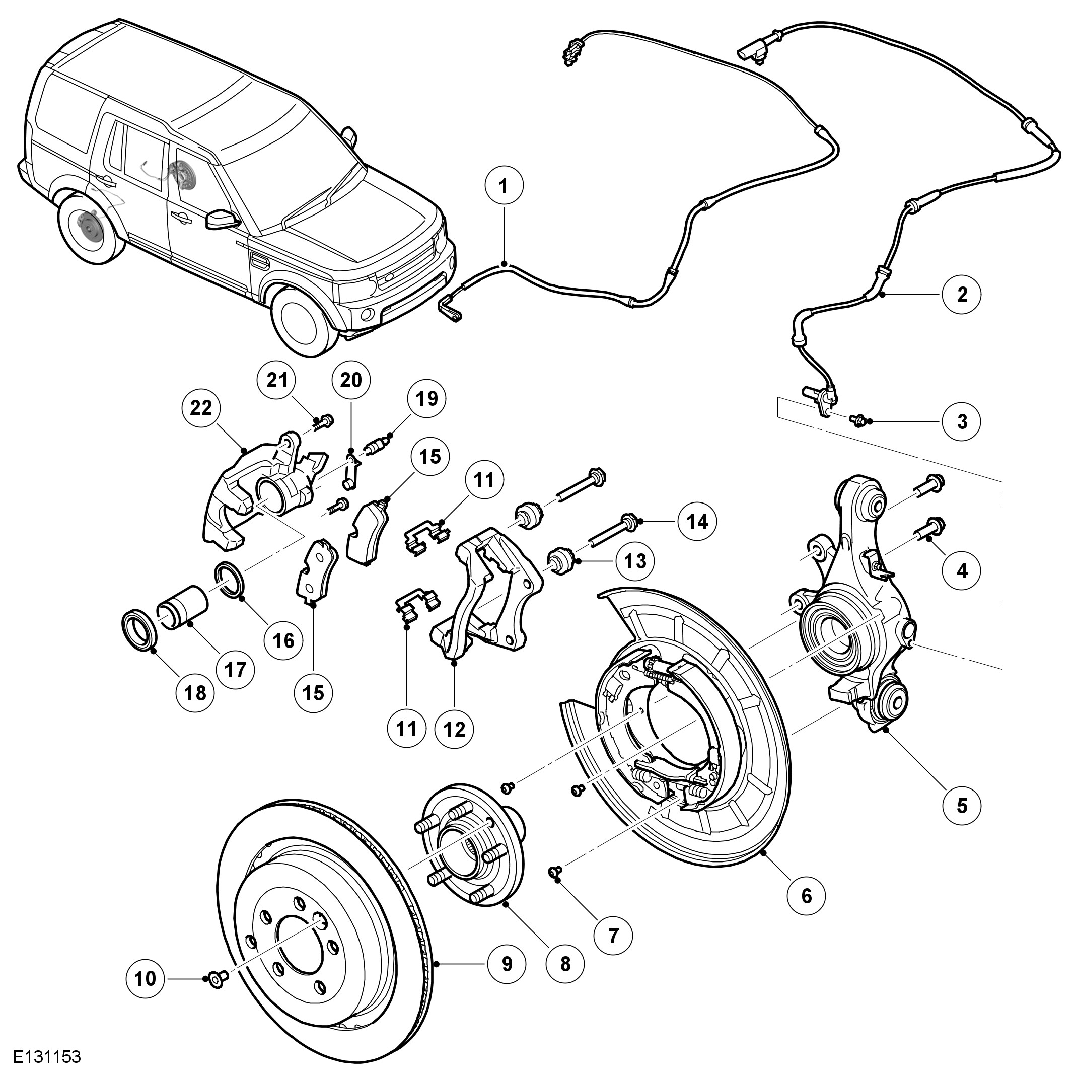 The brake caliper is attached to the rear knuckle. The brake pads are made from an asbestos free material. The inboard brake pad of the right rear brake incorporates a wear sensor.