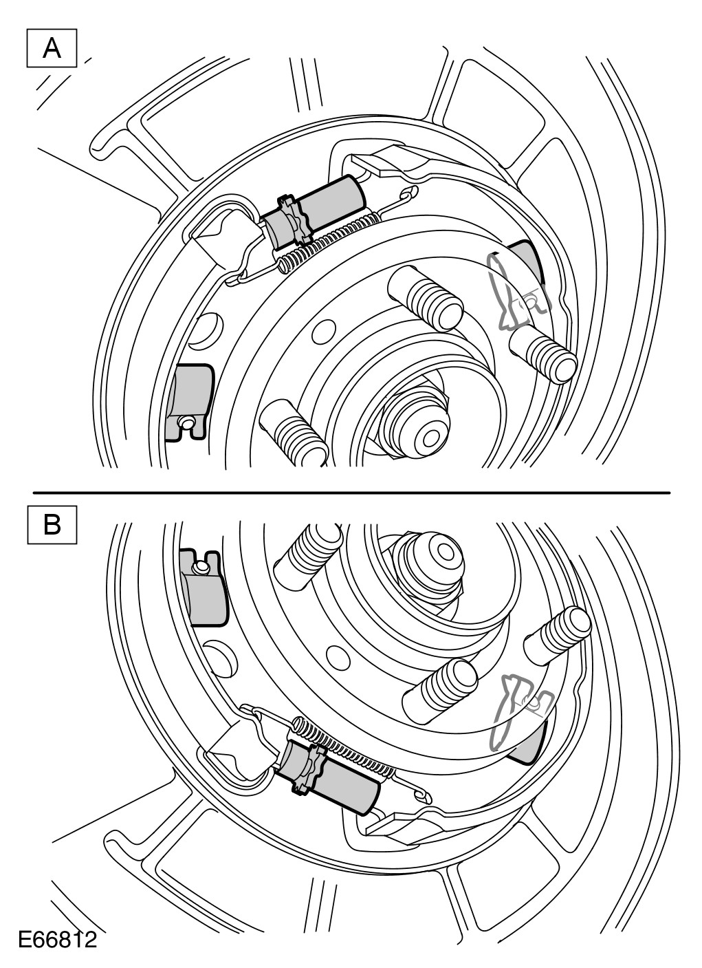CAUTION: Make sure that the green bias spring is installed to the right hand parking brake shoes and the red bias spring is installed to the left hand parking brake shoes.