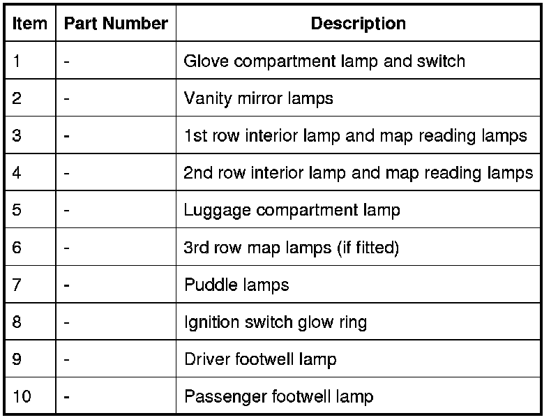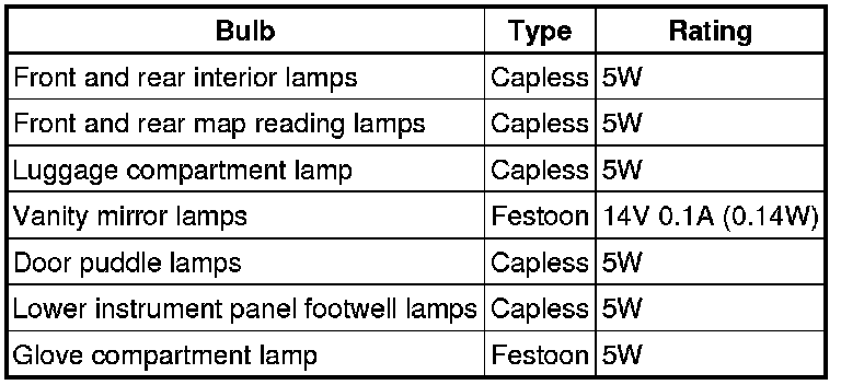 The following table shows the bulbs used for the interior lighting system and their type and specification.