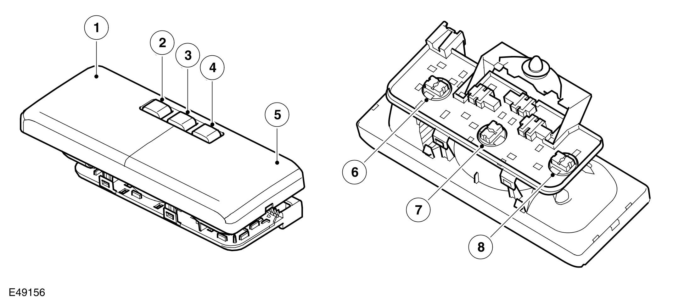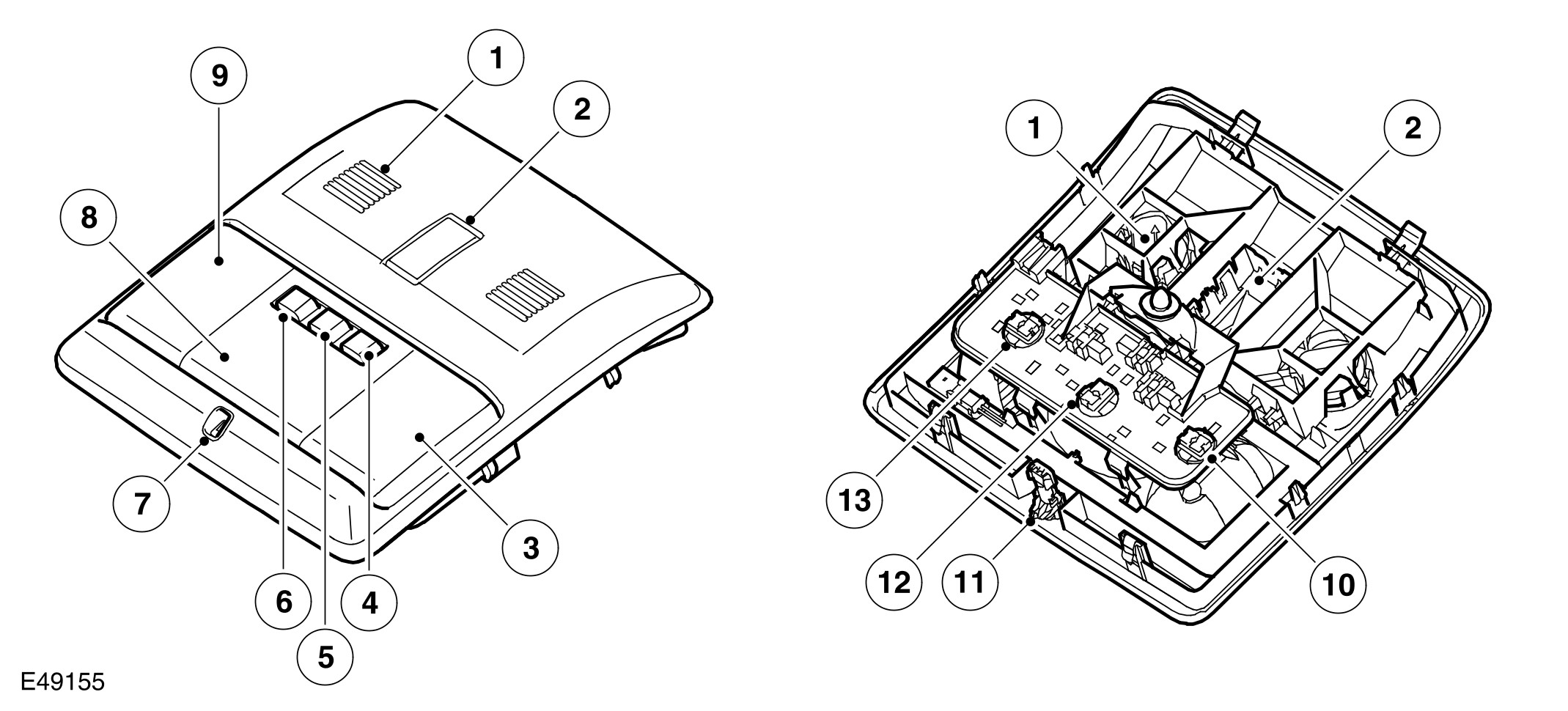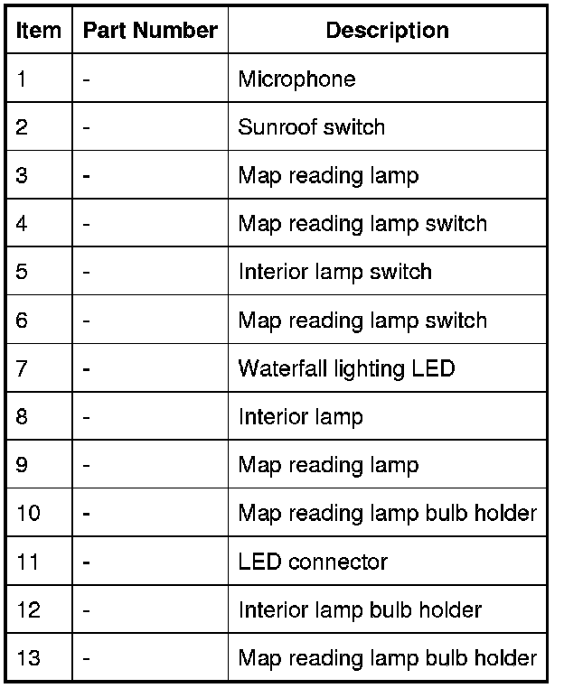 On high line specification vehicles, the row 1 (front) interior lamp is located in a housing which can also contain the sunroof switch and/or the voice activation microphones, depending on specification. The row 2 (rear) interior lamp is also located in a housing which contains the rear heating controls.
