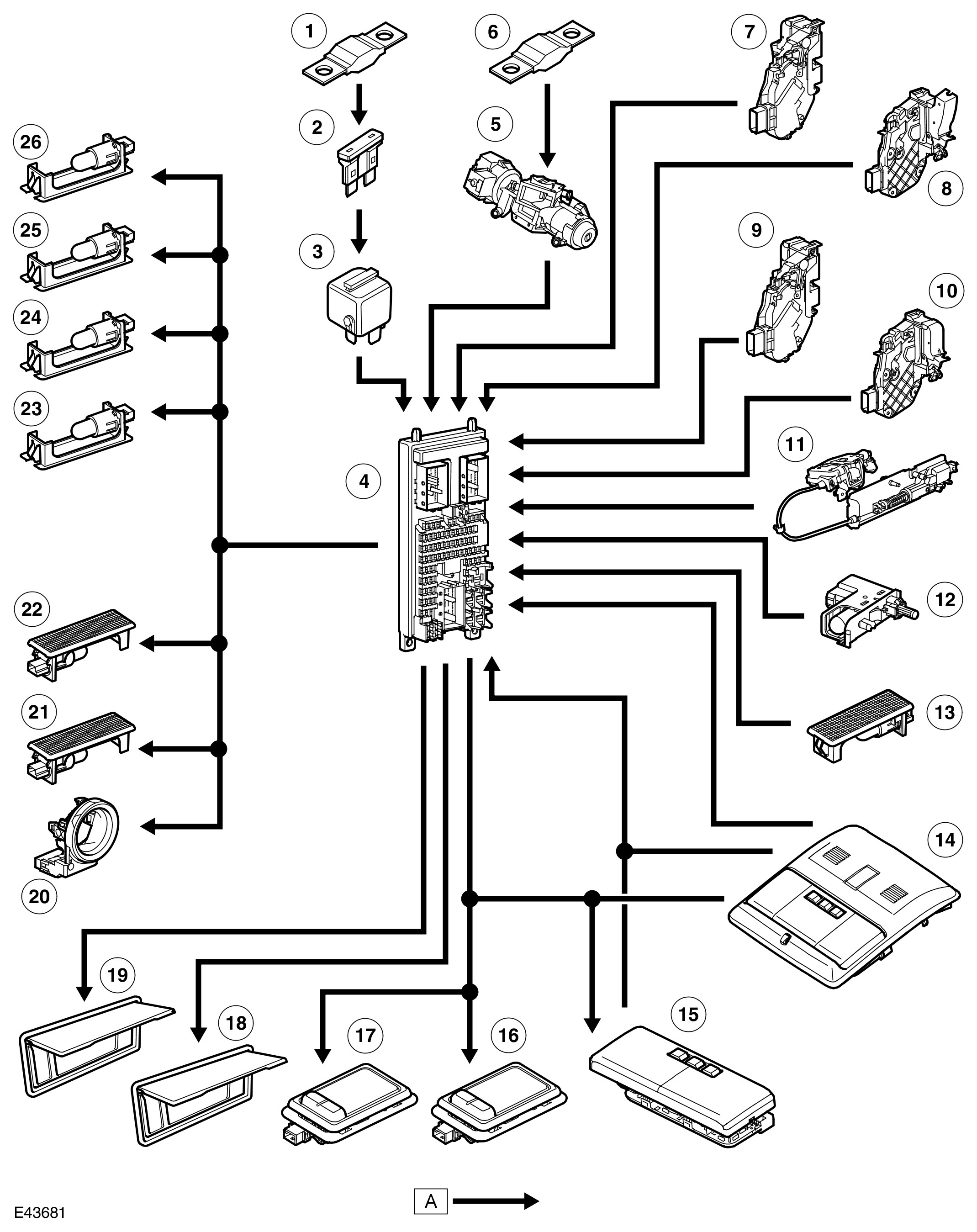 A luggage compartment lamp is located in a central position in the rear header trim panel at the rear of the vehicle, above the tail gate aperture. The luggage compartment lamp is controlled by the CJB and operates as part of the interior lighting functionality.