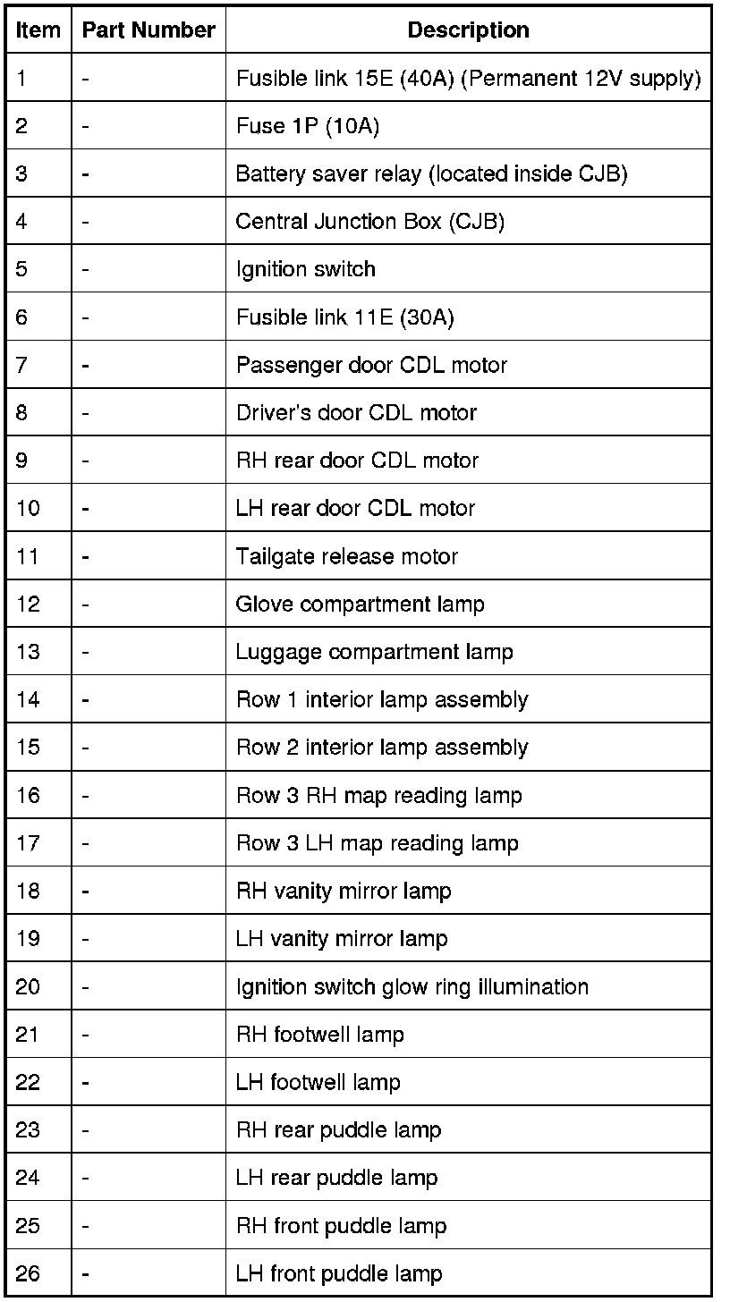 The interior lamps are controlled by a timer within the CJB which allows a 60 delay period for the lamps to remain on after the ignition has been switched off or when the vehicle is unlocked. The following interior lamps are subject to the delay period: