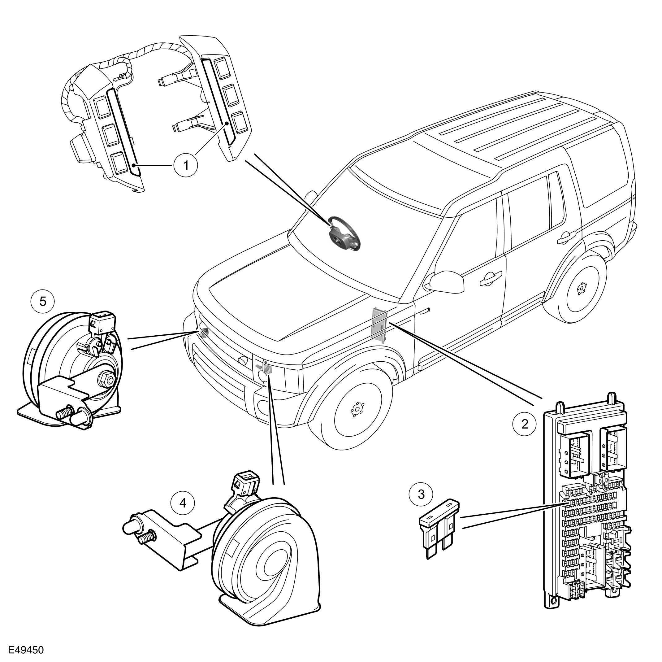 Two horns are fitted to the vehicle; a high tone and a low tone. The horns are mounted on brackets, which are attached to the front end carrier assembly, on each side of the radiator.