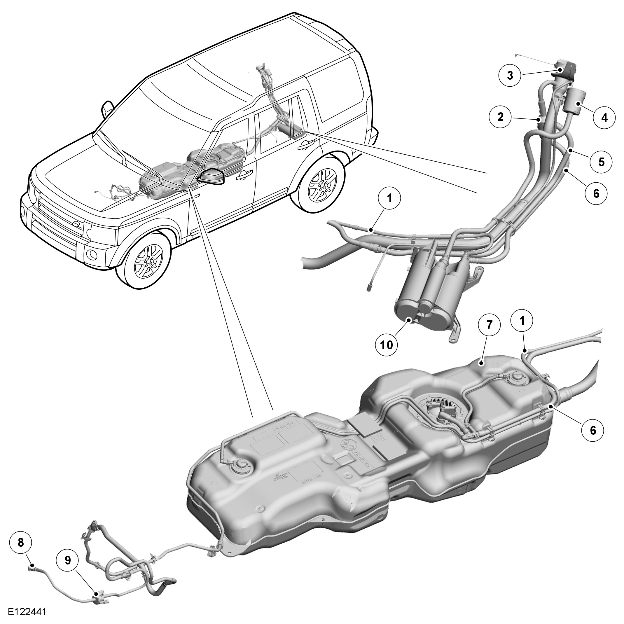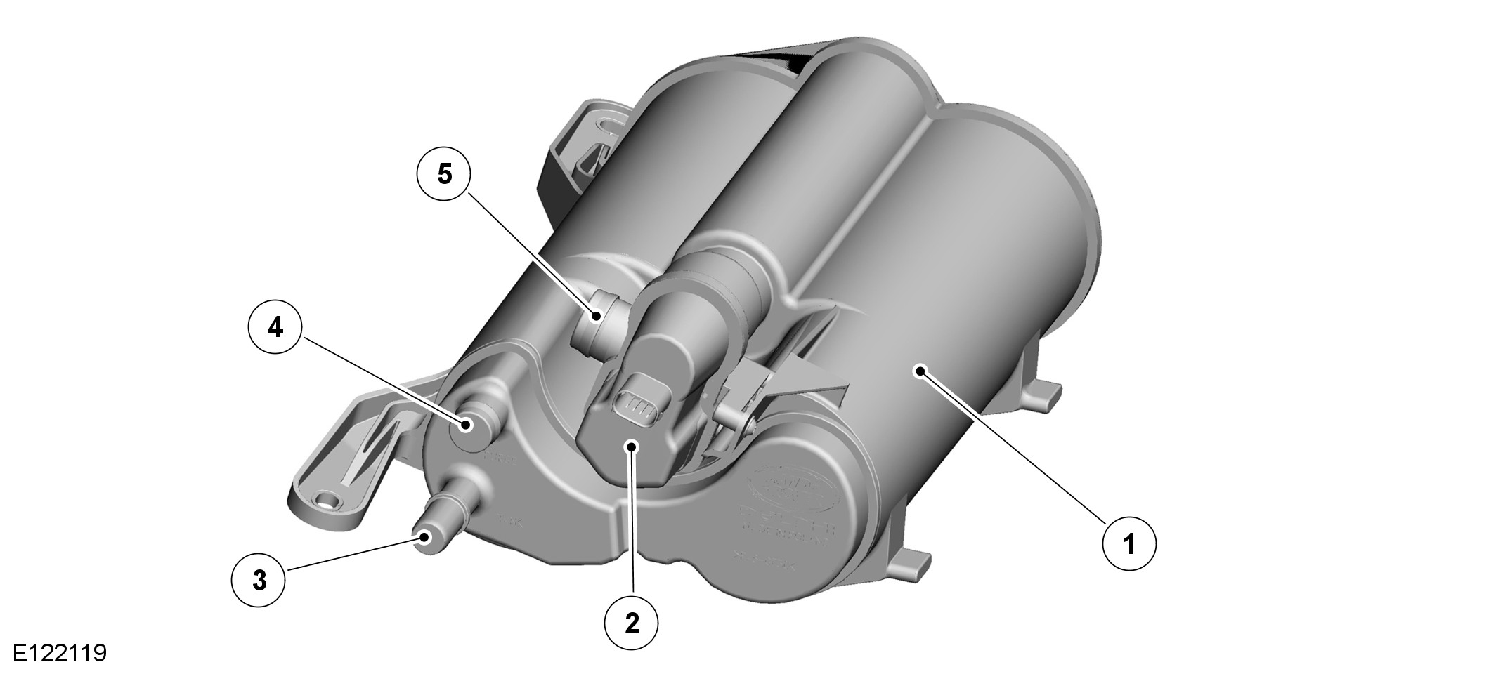 The canister has three connections for attachment of the pipes from the atmospheric vent, the purge valve and the tank vent. On NAS vehicles, the DMTL pump is installed between the atmospheric vent connection and the atmospheric vent pipe.