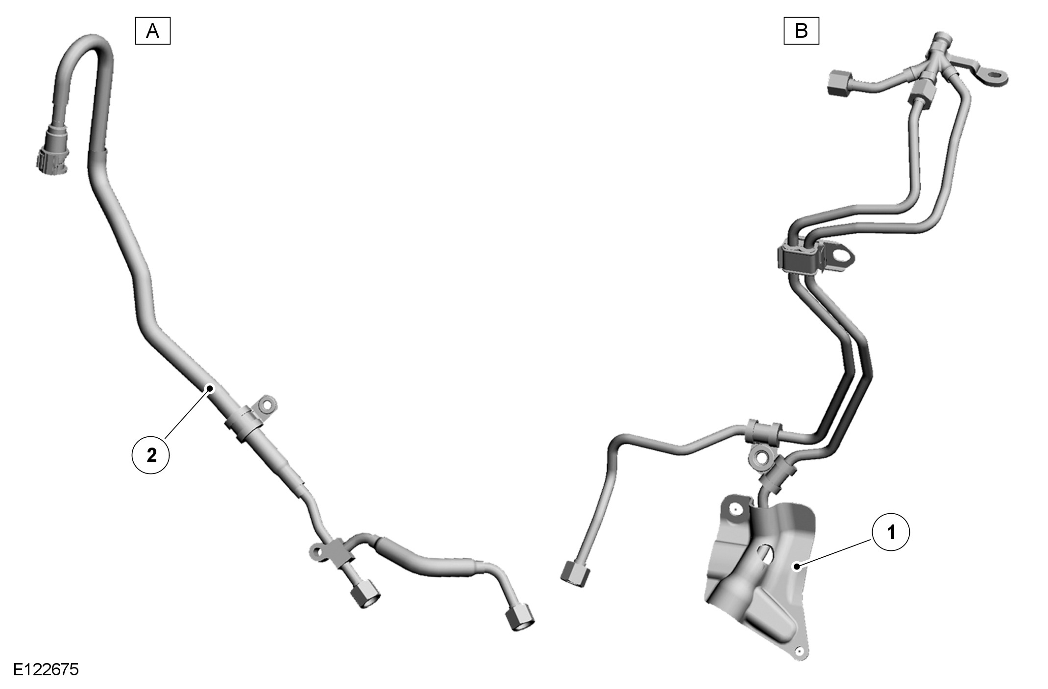 The HP fuel lines connect the HP fuel pumps to the RH (right-hand) fuel rail and the crossover tube. Two P-clips and a pipe clamp attach the HP fuel lines to the cylinder block and the RH (right-hand) cylinder head respectively. An integral bracket on the front HP fuel line is attached to a stud on the front-upper RH (right-hand) timing cover. An acoustic cover is installed on the bottom of the front HP fuel line.