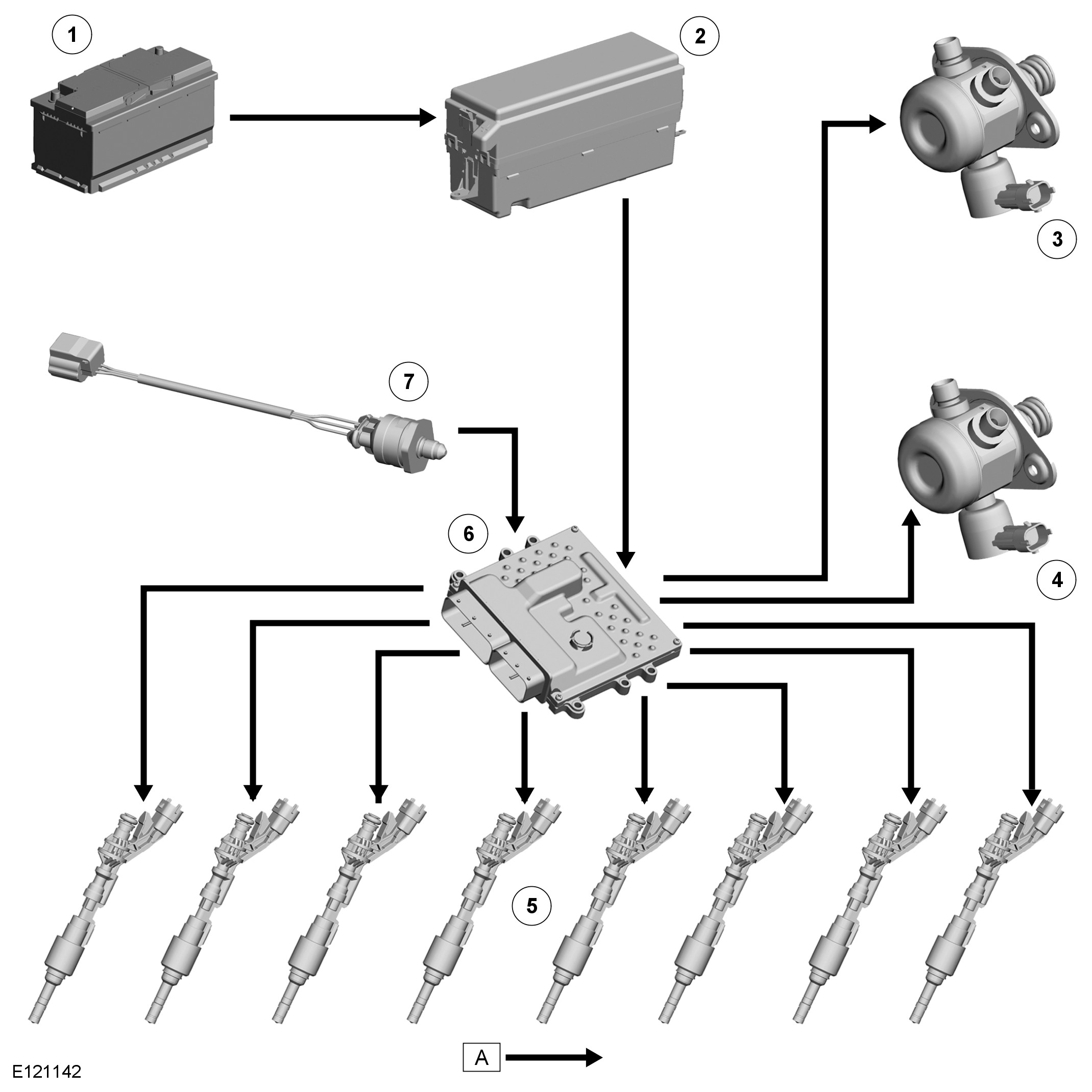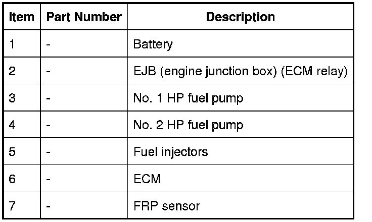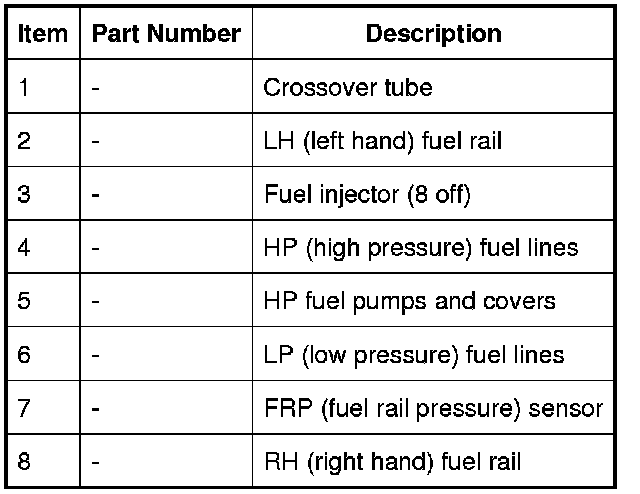 LP fuel from the pump in the fuel tank is pressurized by the HP fuel pumps and supplied to the fuel injectors via the fuel rails and crossover tube. The ECM (engine control module) controls the fuel injectors and HP fuel pumps to inject the required volume of fuel into the combustion chambers.