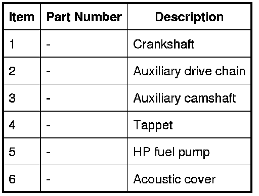 The auxiliary camshaft is driven by the crankshaft, via the auxiliary drive chain, at engine speed. The auxiliary camshaft is timed to match the pump delivery strokes with crankshaft position.