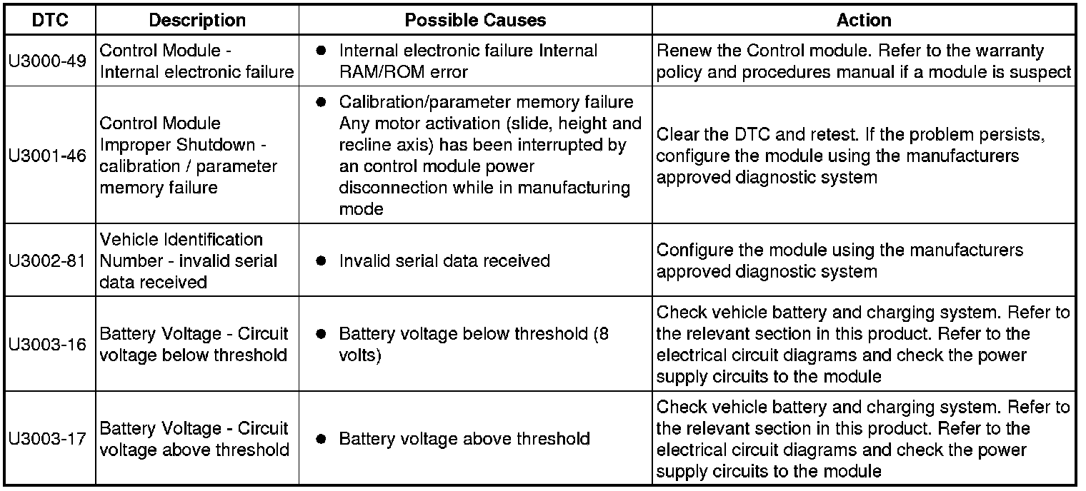 The table below lists all Diagnostic Trouble Codes (DTCs) that could be logged in the Drivers/Passenger Seat Modules, for additional Diagnosis and Testing information refer to the relevant Diagnosis and Testing Section. For additional information, refer to Seats Initial Inspection and Diagnostic Overview