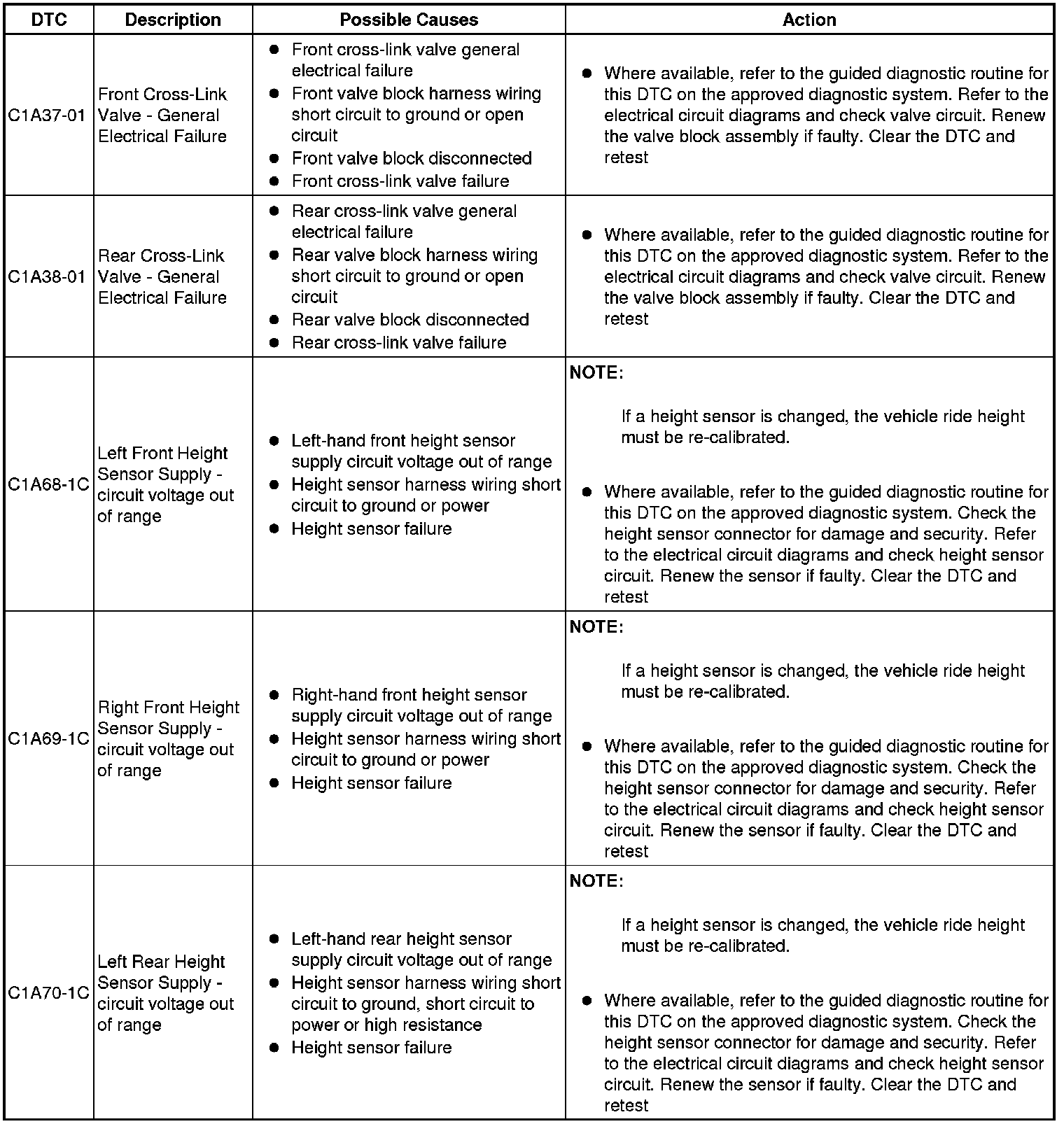 The table below lists all Diagnostic Trouble Codes (DTCs) that could be logged in the Air Suspension Control Module, for additional Diagnosis and Testing information refer to the relevant Diagnosis and Testing Section. For additional information, refer to Vehicle Dynamic Suspension Vehicle Dynamic Suspension