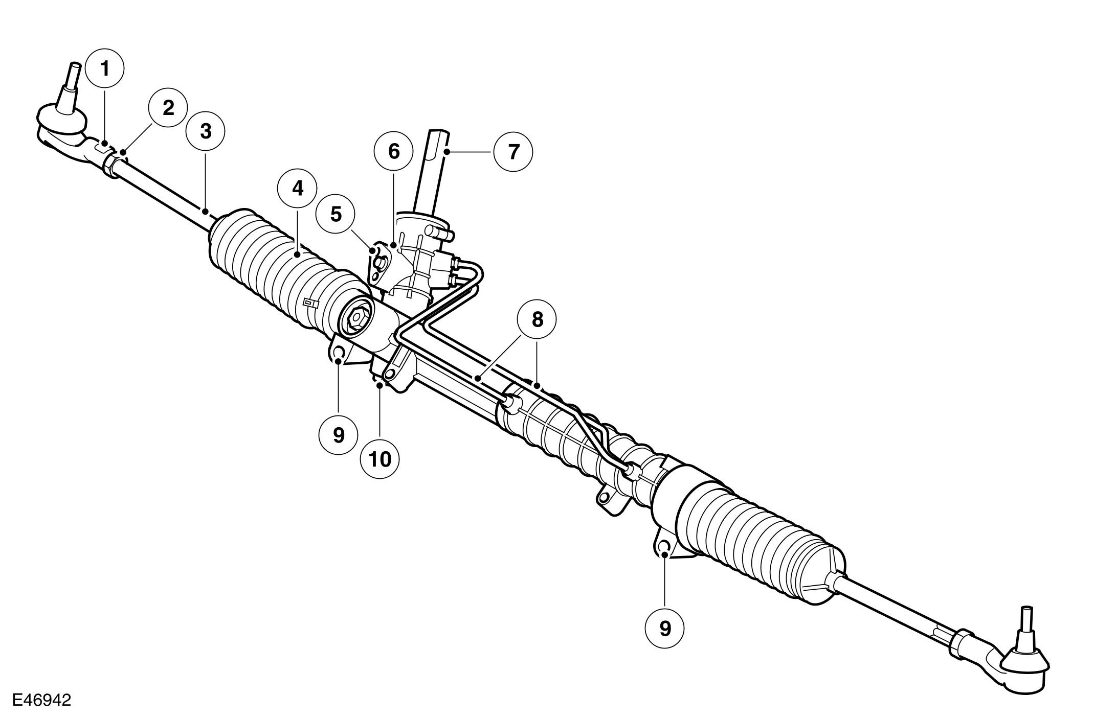 The steering gear uses a rack with an integrated piston which is guided on plain bearings within the rack housing. The pinion, which is attached to the valve unit, runs in bearings and meshes with the rack teeth. The rack is pressed against the pinion by a spring loaded yoke which ensures that the teeth mesh with the minimum of play. The pinion is connected to the valve unit via a torsion bar. The rotary motion of the steering wheel is converted into linear movement of the rack by the pinion and is initiated by the valve unit. This movement is transferred into movement of the road wheels by adjustable tie-rods.