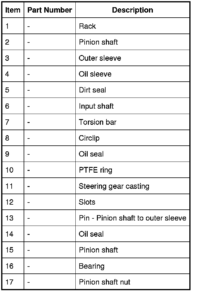 The pinion shaft has machined upper teeth on its central diameter which mate with teeth on the steering gear rack. A slot, machined in the upper end of the pinion shaft mates with the dog-tooth on the input shaft. The pinion shaft locates in the pinion housing and rotates on ball and roller bearings.