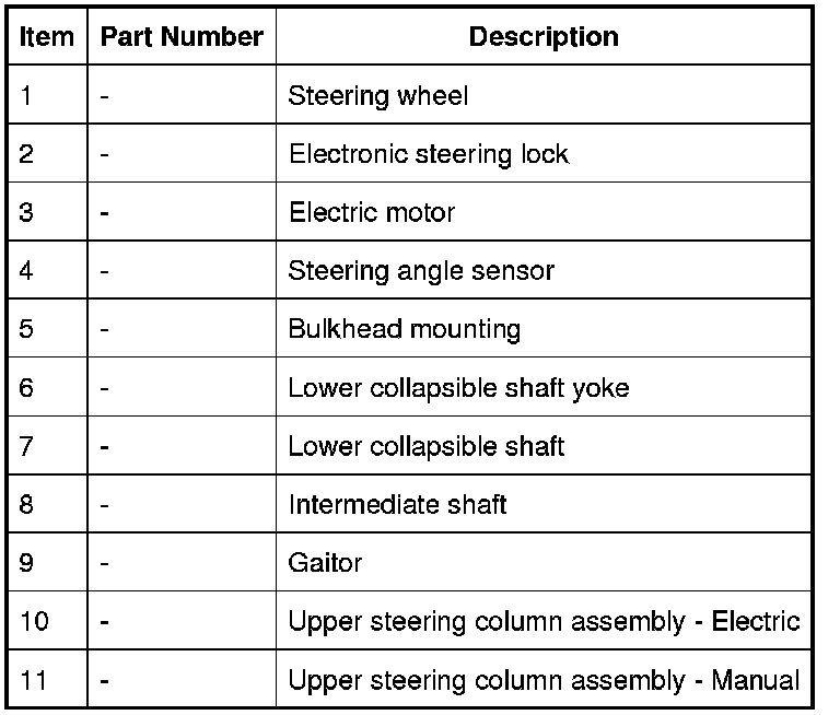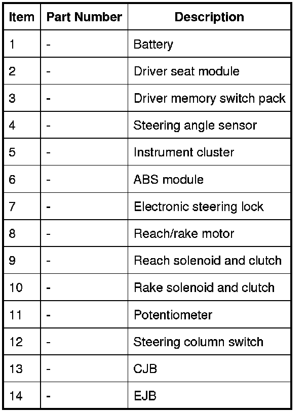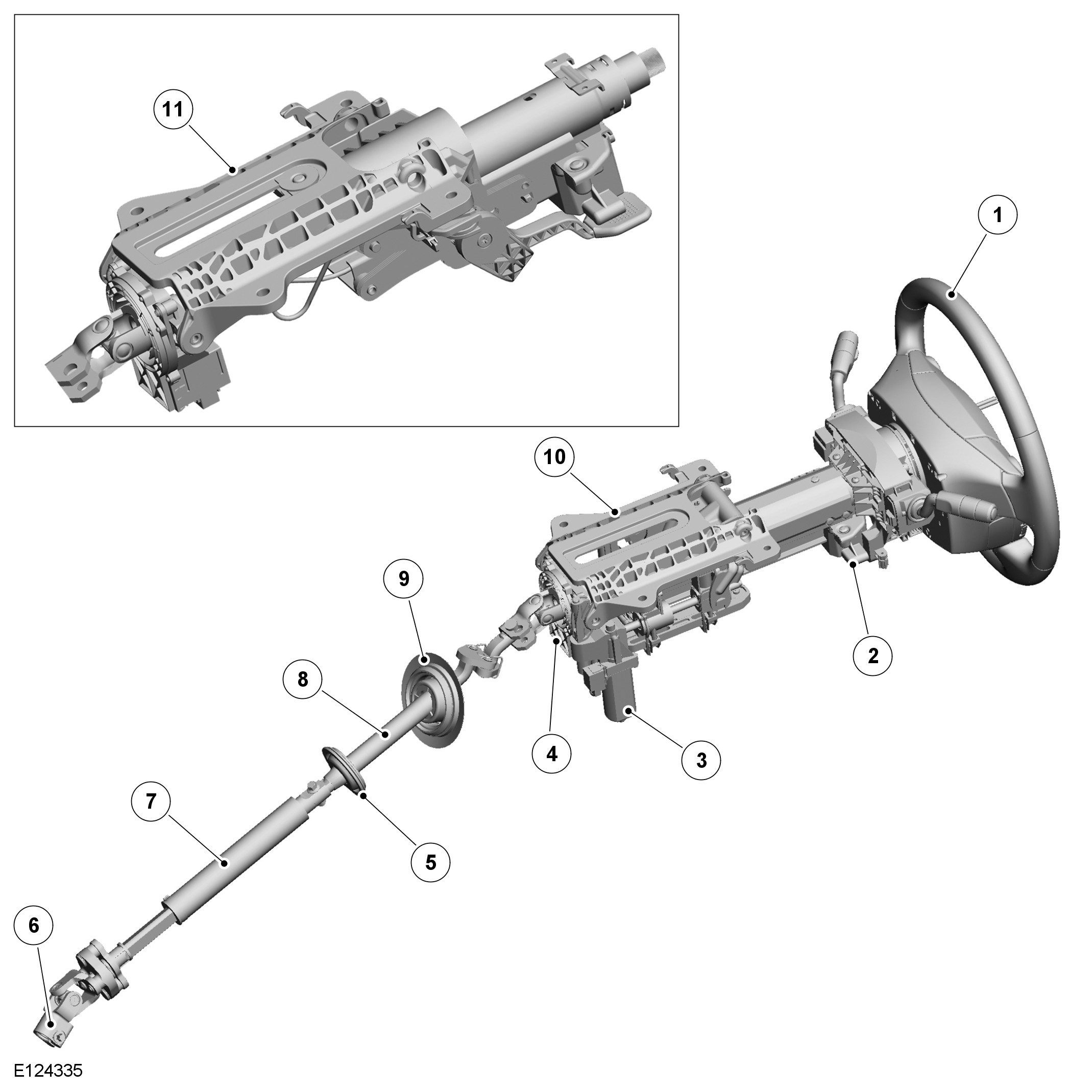 The upper steering column assembly is electronically adjustable for steering wheel reach and rake and is controlled by the CJB (central junction box). The upper steering column assembly also provides the location for the electronic steering lock mechanism and the steering angle sensor.