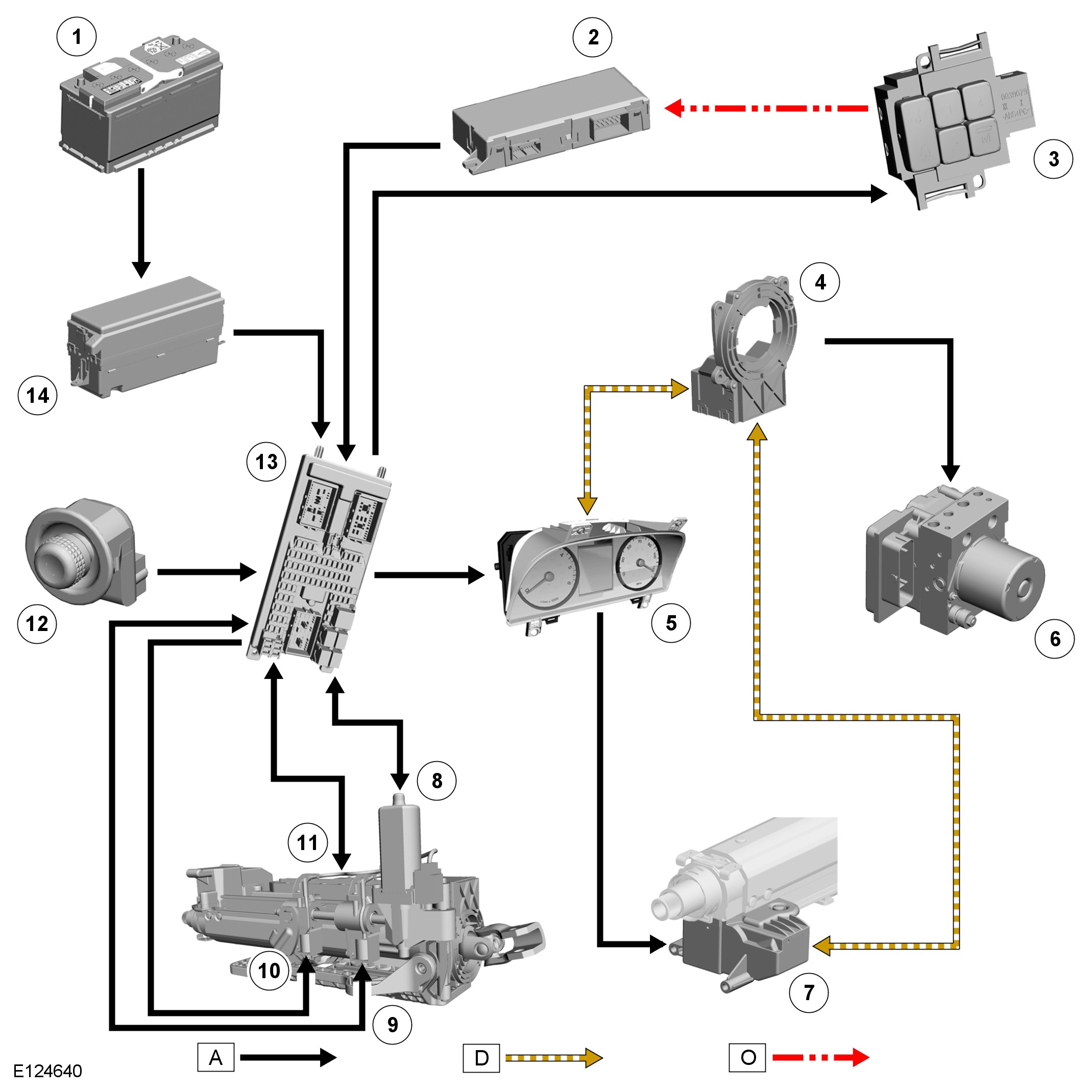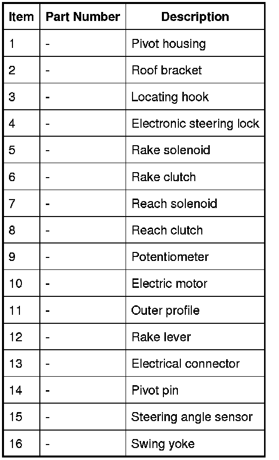 The electric steering column is linked to and controlled by the memory control module. The memory control module provides storage of three separate memory positions which are stored against three individual vehicle keys. For additional information, refer to Seats . The electric column also has an easy egress feature which lifts the column to its maximum rake to allow easier access to the vehicle.