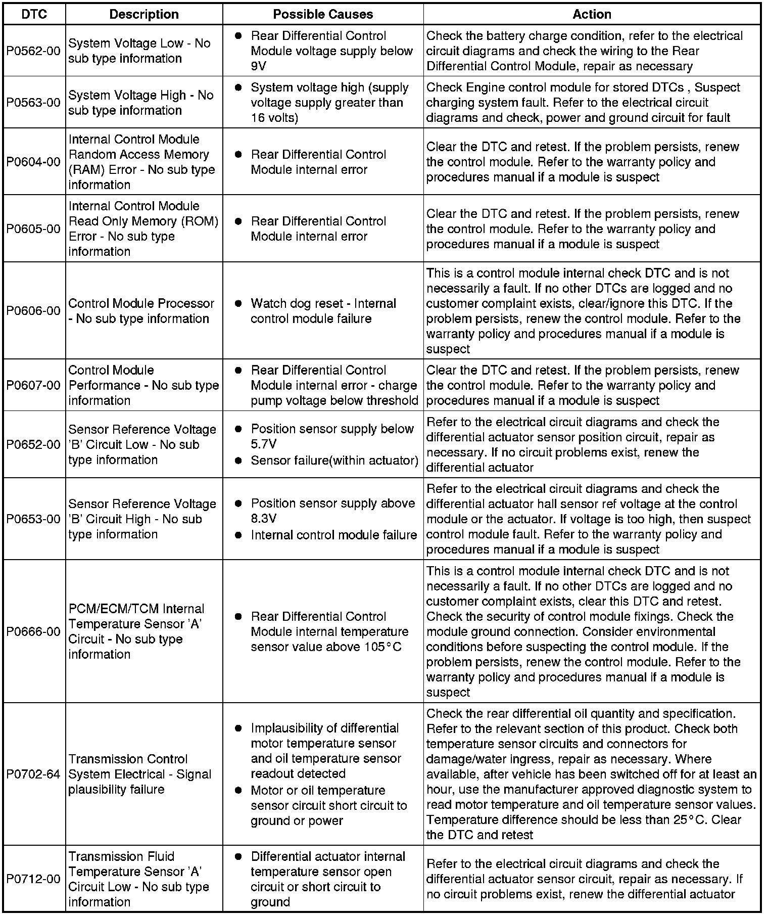 The table below lists all Diagnostic Trouble Codes (DTCs) that could be logged in the Rear Differential Control Module, for additional Diagnosis and Testing information refer to the relevant Diagnosis and Testing Section. For additional information, refer to Rear Drive Axle and Differential Initial Inspection and Diagnostic Overview