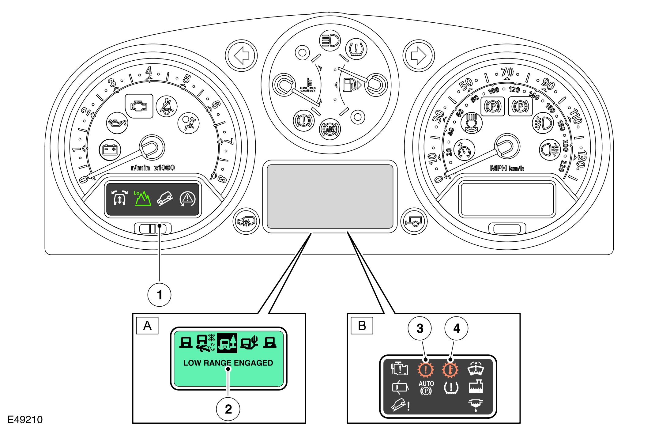On vehicles fitted with the high line instrument cluster there will be one low range status indicator. This indicator will take the form of a mountain symbol and has the following logic: