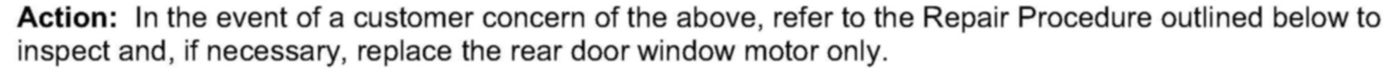 CHECK REAR DOOR WINDOW MOTOR FUNCTIONALLY AND HARNESS