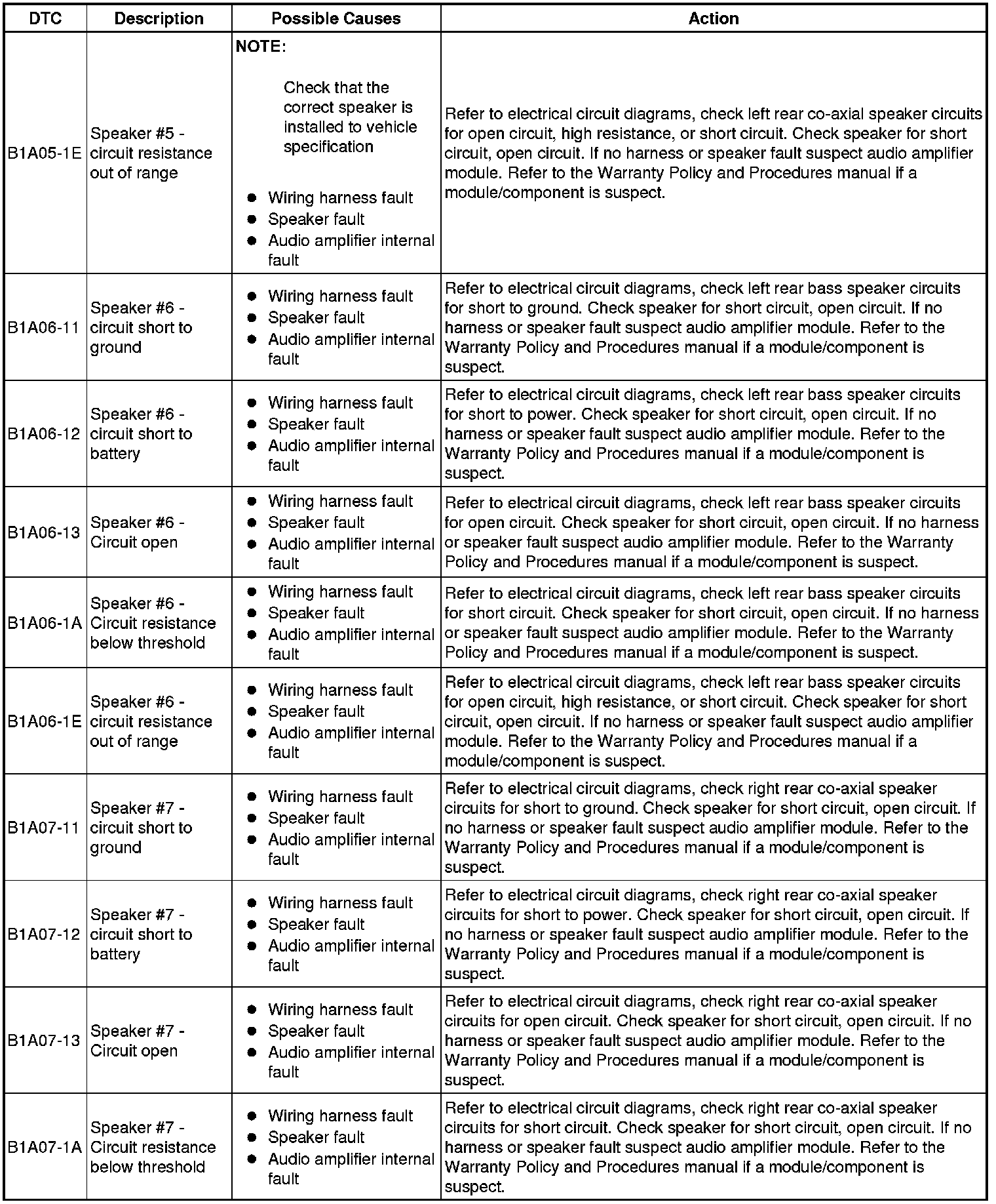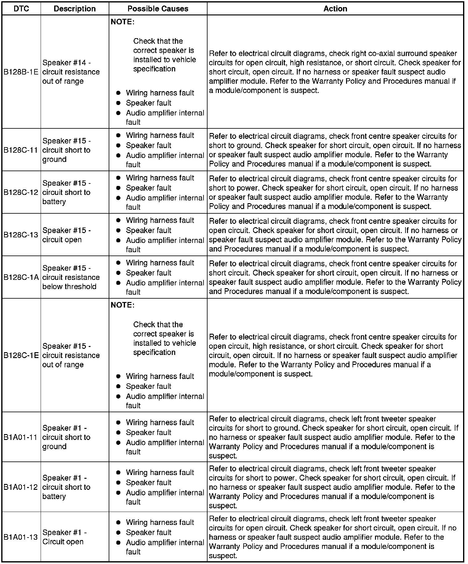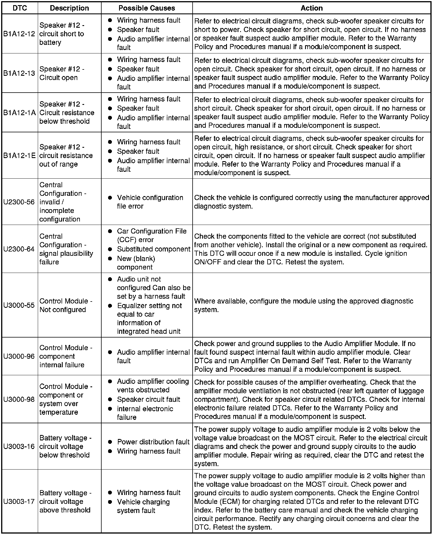 The table below lists all Diagnostic Trouble Codes (DTCs) that could be logged in the Audio Amplifier Module, for additional Diagnosis and Testing information refer to the relevant Diagnosis and Testing Section. For additional information, refer to Information and Entertainment System Initial Inspection and Diagnostic Overview