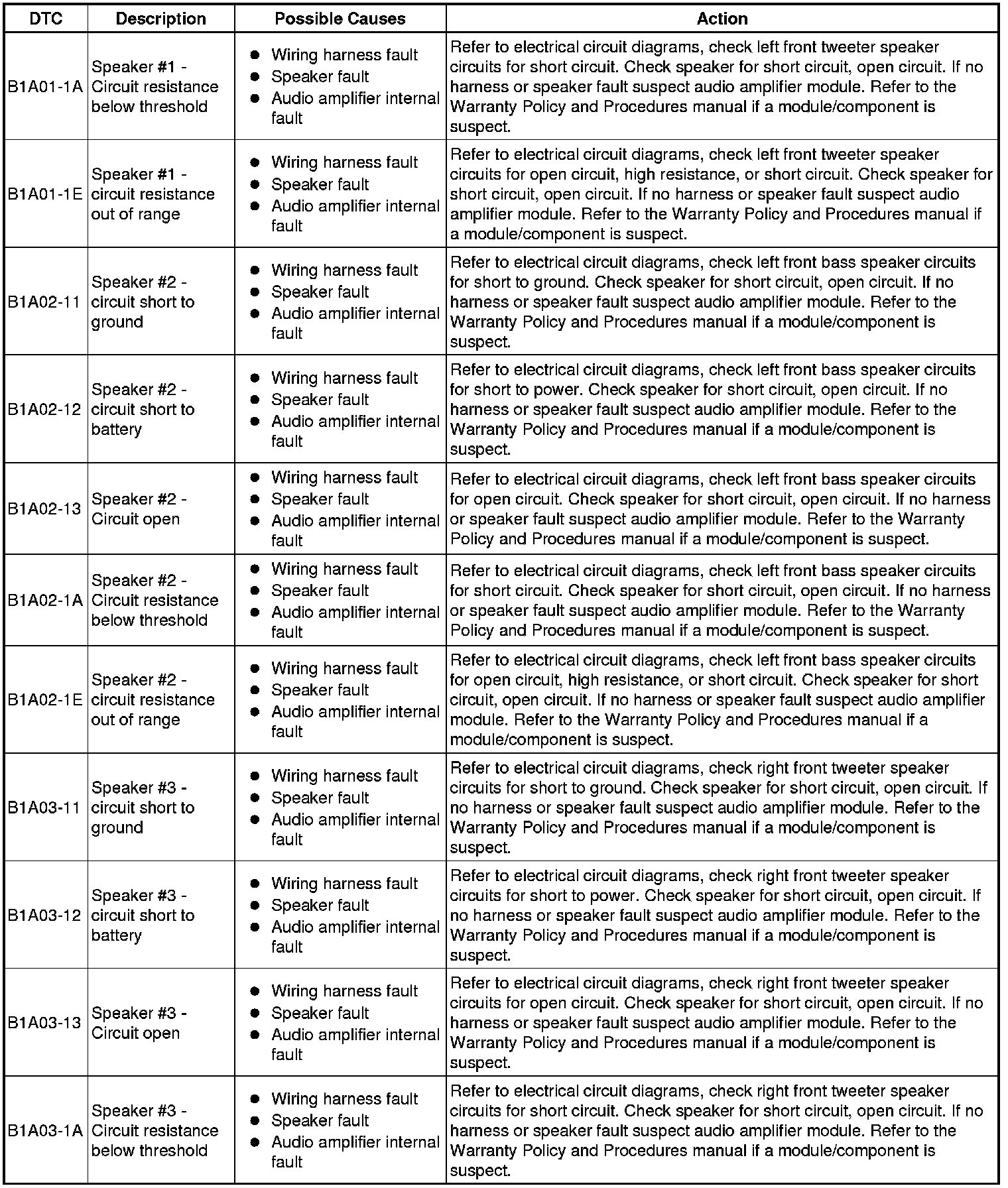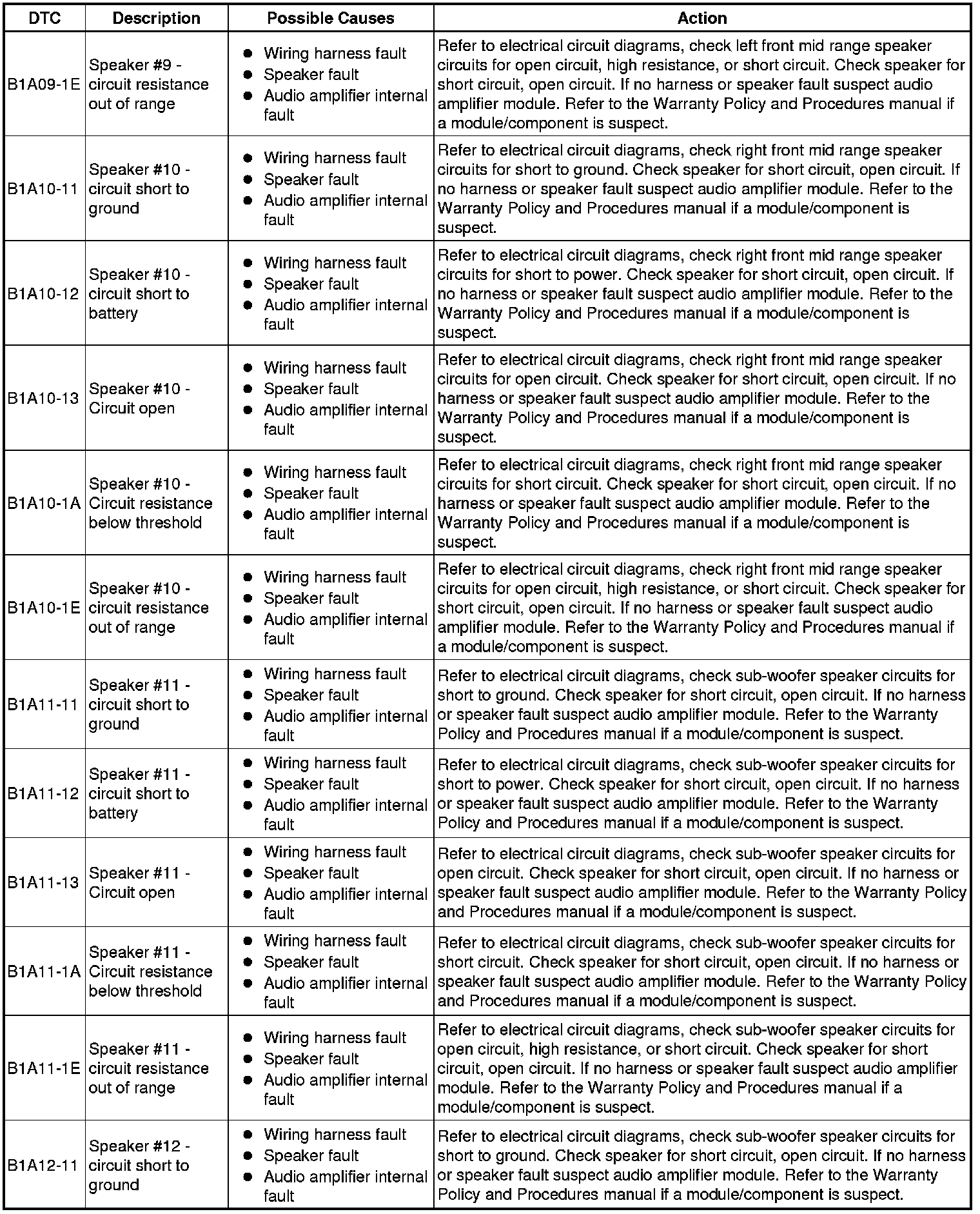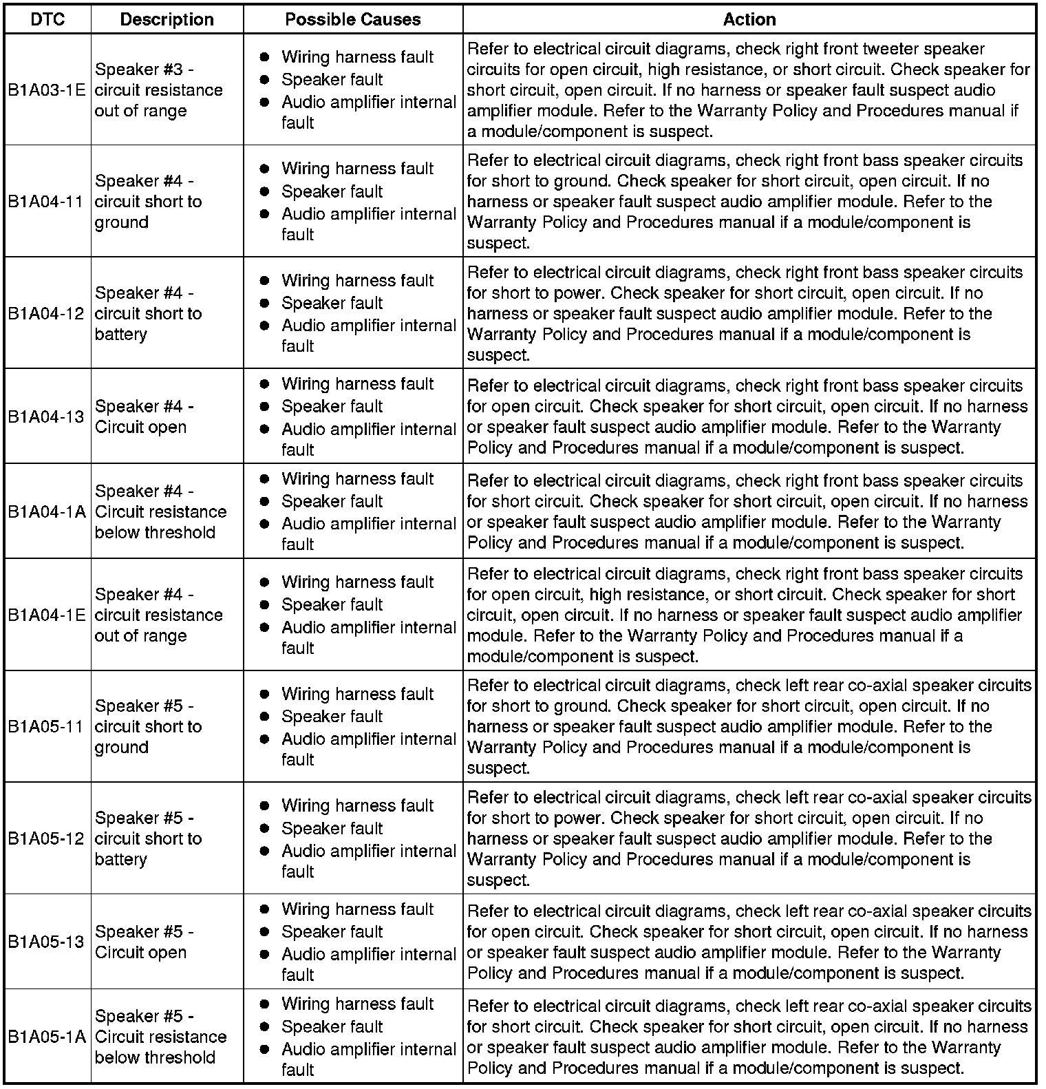 The table below lists all Diagnostic Trouble Codes (DTCs) that could be logged in the Audio Amplifier Module, for additional Diagnosis and Testing information refer to the relevant Diagnosis and Testing Section. For additional information, refer to Information and Entertainment System Initial Inspection and Diagnostic Overview