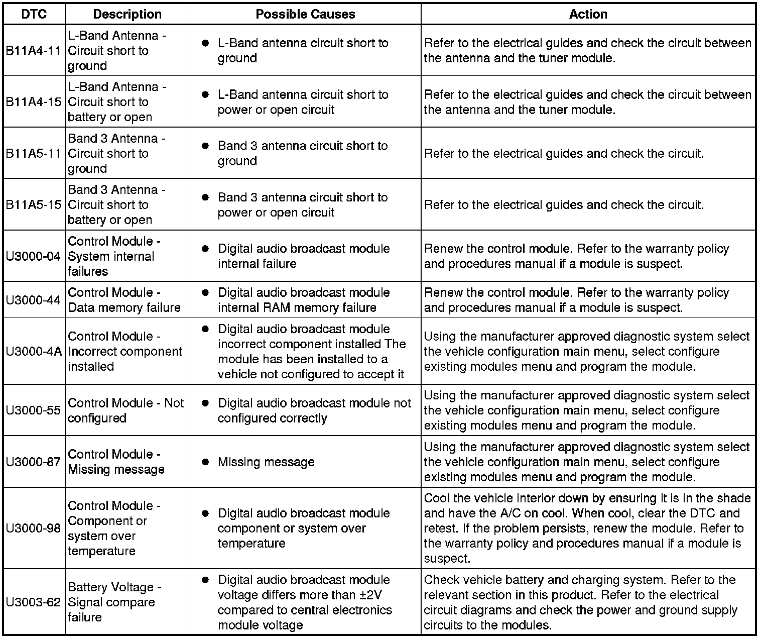 The table below lists all Diagnostic Trouble Codes (DTCs) that could be logged in the Digital Audio Broadcast Module, for additional Diagnosis and Testing information refer to the relevant Diagnosis and Testing Section. For additional information, refer to Information and Entertainment System Initial Inspection and Diagnostic Overview