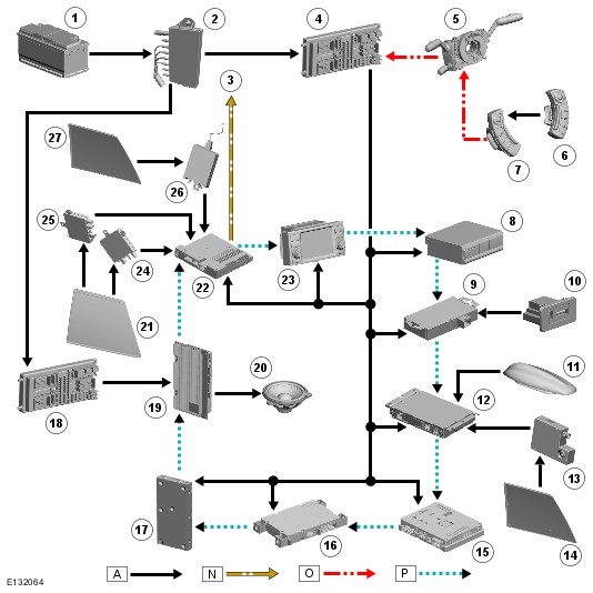 The components of the complete audio/infotainment system are all connected on the Media Orientated Systems Transport (MOST) ring. The MOST ring is a fibre optic communications bus for multi media applications. Sound and control information is passed around the MOST ring and can be picked up by any of the systems units. For example, sound information is sent from the CD (compact disc) autochanger along the MOST ring and is collected by the audio amplifier which then outputs the sound to the speakers.