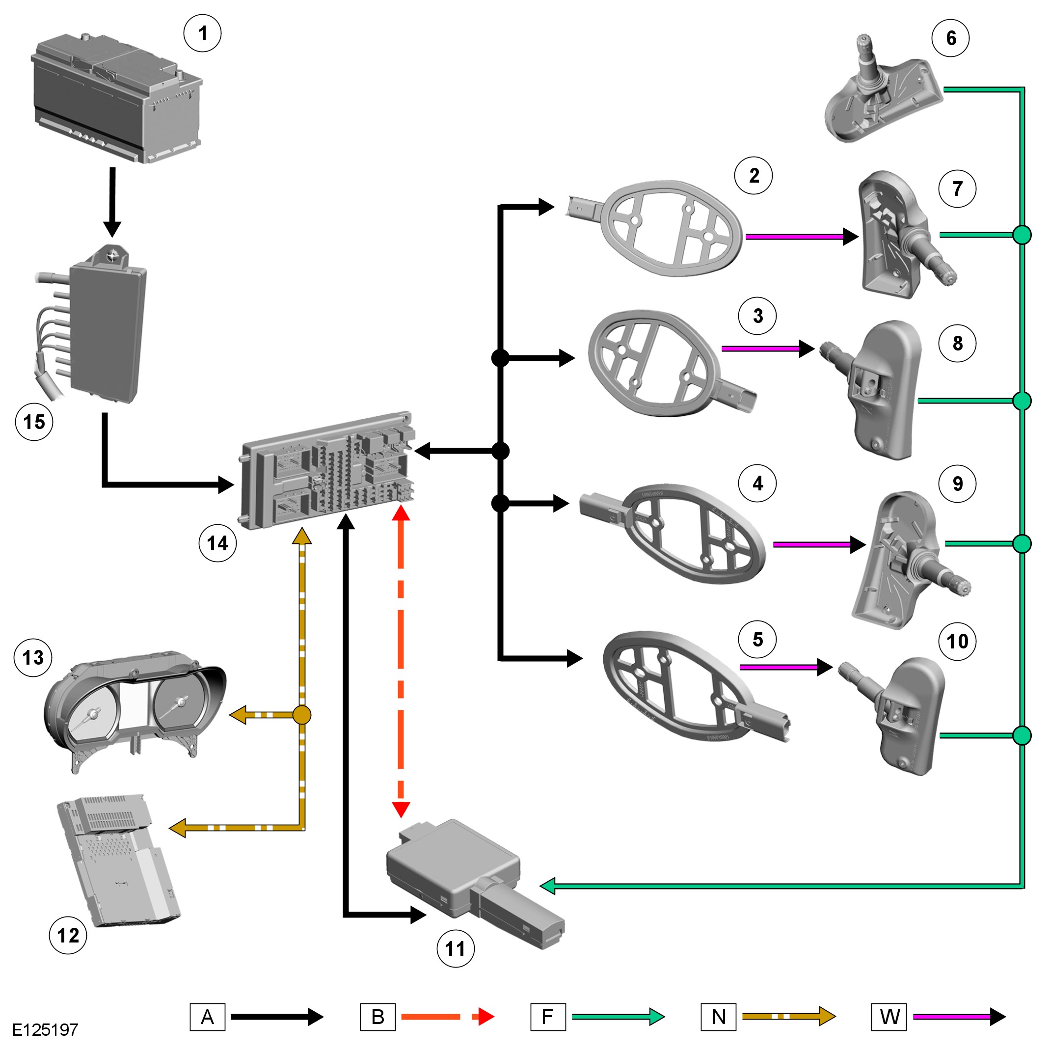 The RF receiver receives transmissions from each of the tire pressure sensors via an internal antenna. This information is then communicated to the CJB (central junction box) via a dedicated Local Interconnect Network (K-bus).