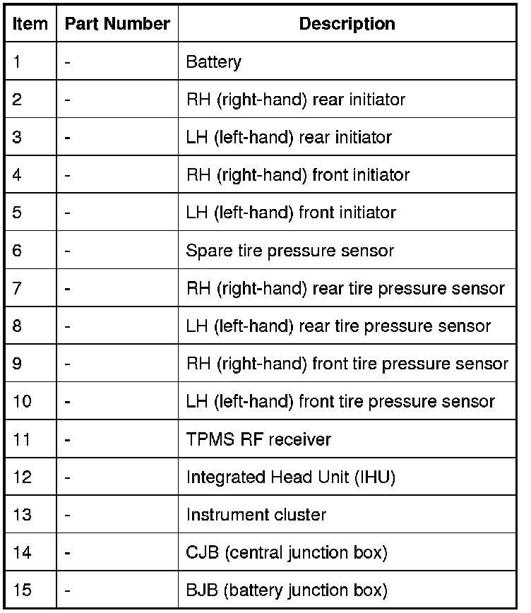 Each time the vehicle is driven, the CJB (central junction box) transmits a Low Frequency (LF) (125 KHz) signal to each initiator in turn. This is received by the tire pressure sensor which transmits a Radio Frequency (RF) (315 or 433 MHz depending on market) signal to the RF receiver. This signal contains coded data which corresponds to sensor identification, air pressure, air temperature and acceleration data. This signal is communicated to the CJB (central junction box) via a K-bus line.