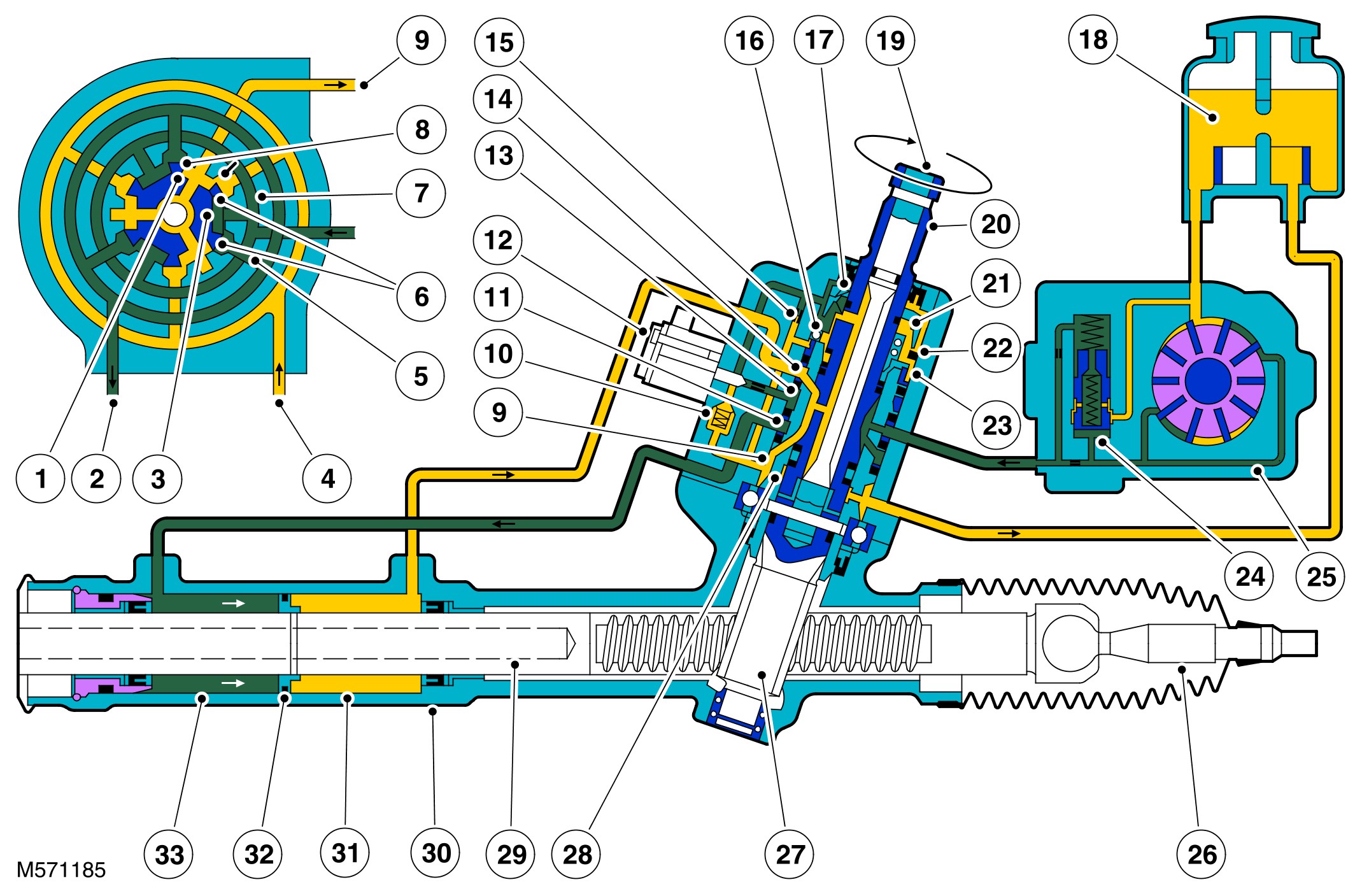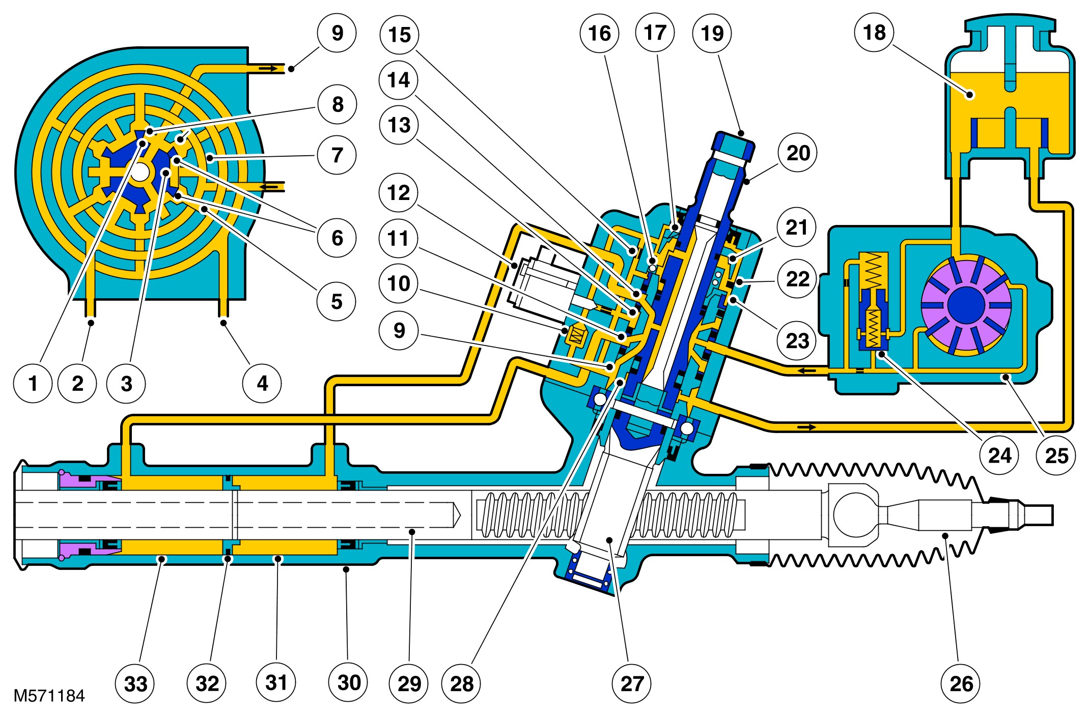 When the engine is started, the power steering pump draws fluid from the reservoir down the low pressure suction line. The fluid passes through the pump and is delivered, via a hose, to the steering rack valve unit.