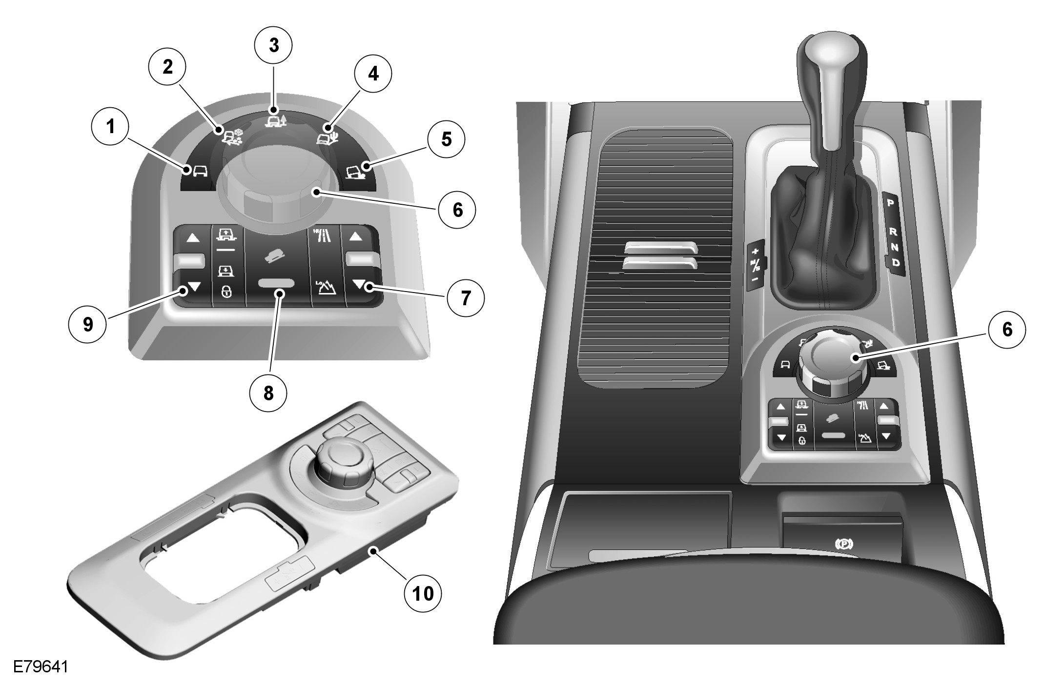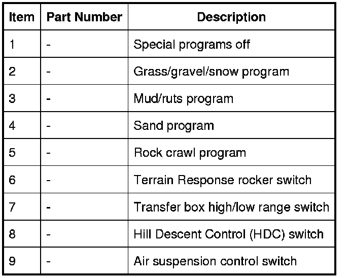 The Terrain Response control selector and the control module are an integral unit. If a fault occurs in either component, the whole unit will require replacement. BEFORE REPLACING THE TERRAIN RESPONSE CONTROL MODULE, ENSURE THAT THE FAULT IS NOT IN ANY OF THE SUB-SYSTEM MODULES.