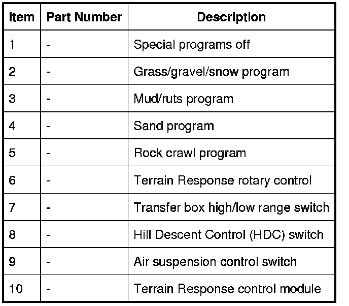 The Terrain Response system uses a combination of a number of vehicle subsystems to achieve the required vehicle characteristics for the terrain selected. The following subsystems make up the Terrain Response system: