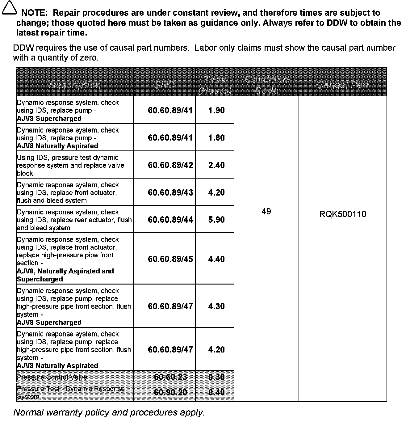 This Technical Bulletin provides a process for Retailers to correctly diagnose Dynamic Response system contamination, to identify if an actuator has failed and to determine which parts may require replacement. A flushing procedure is provided which will enable the dealer to clean the affected parts that do not need to be replaced and ensure that the problem does not re-occur. Should a customer express concern, use IDS to establish which actuator is at fault, and carry out the flush and repair procedure following the Repair Procedure outlined below.