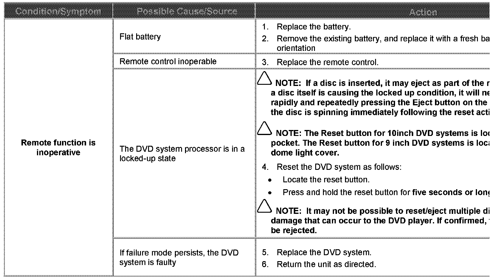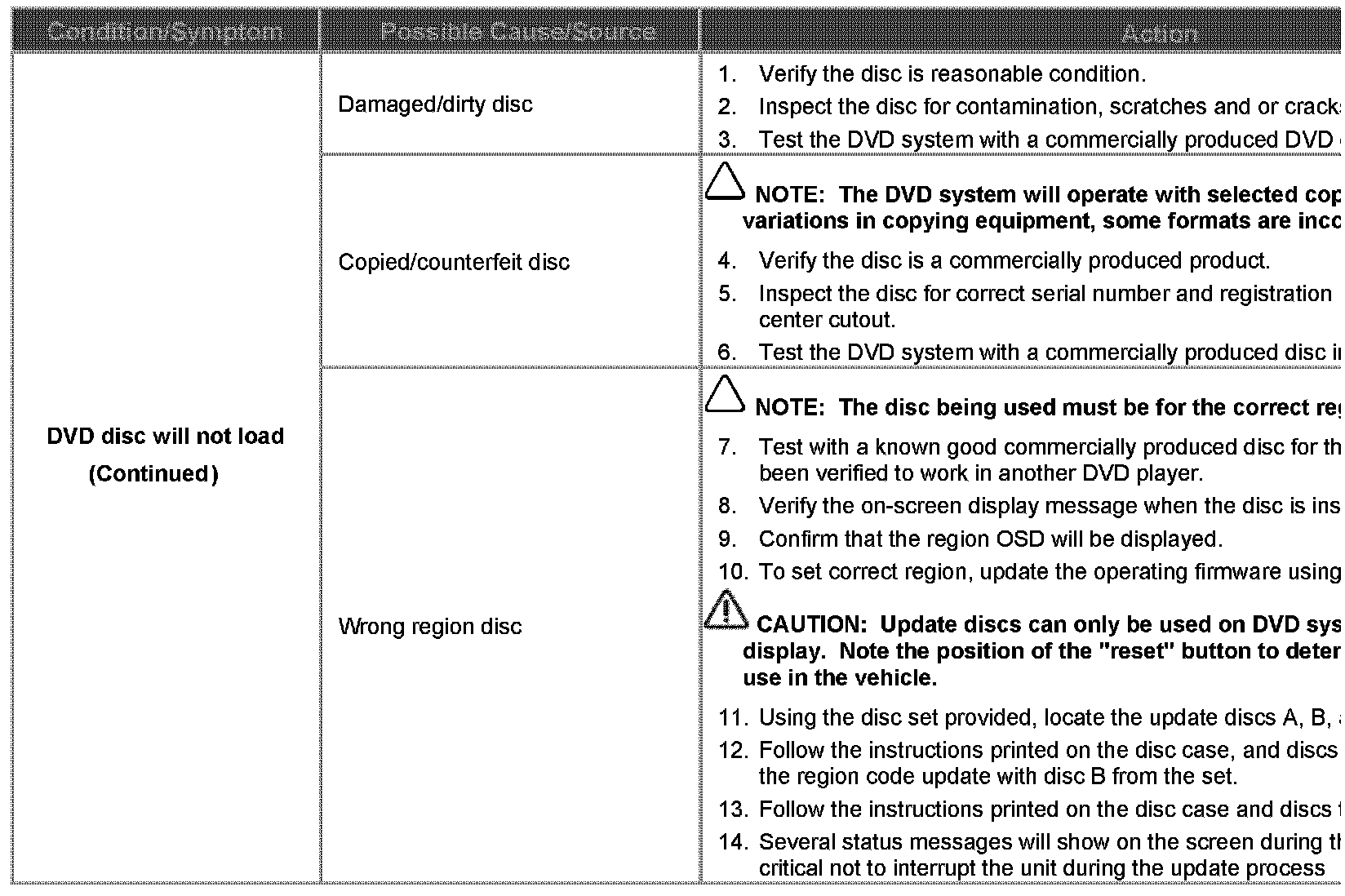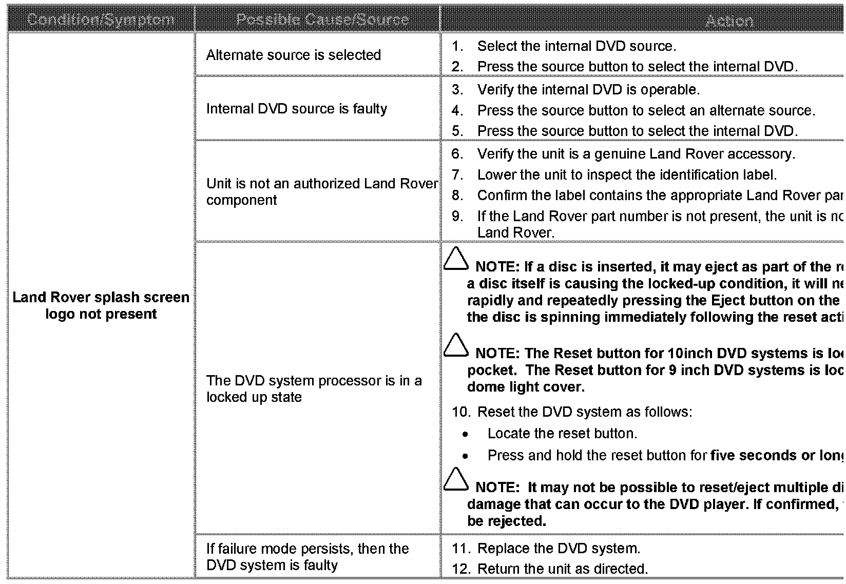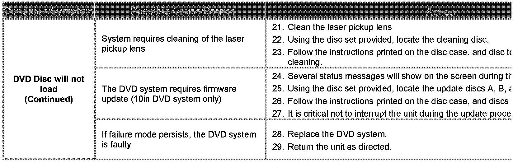 A range of software and hardware issues within the DVD system contribute to difficulty in diagnosis of system faults. The concerns are: failing in use, locking up, refusal to load discs, ejecting/sticking discs, distorted picture. This Technical Bulletin has been issued to supply a Diagnostic Procedure for accessory-installed DVD systems.