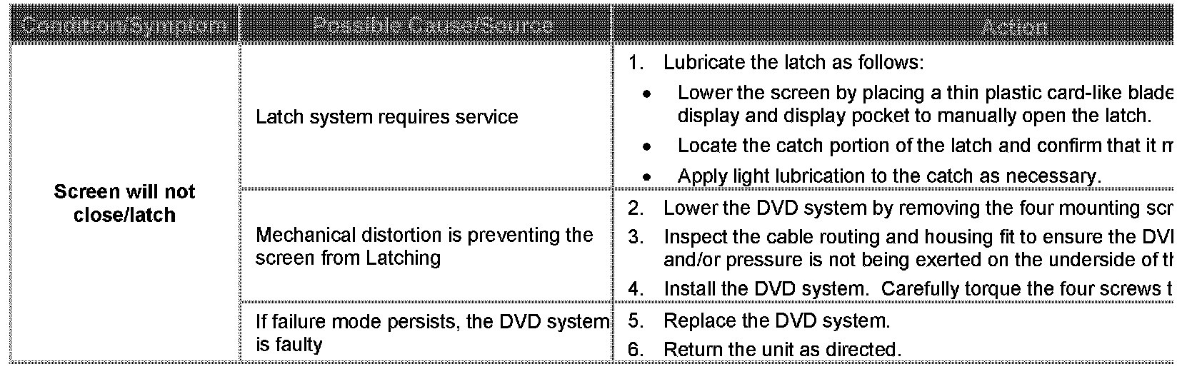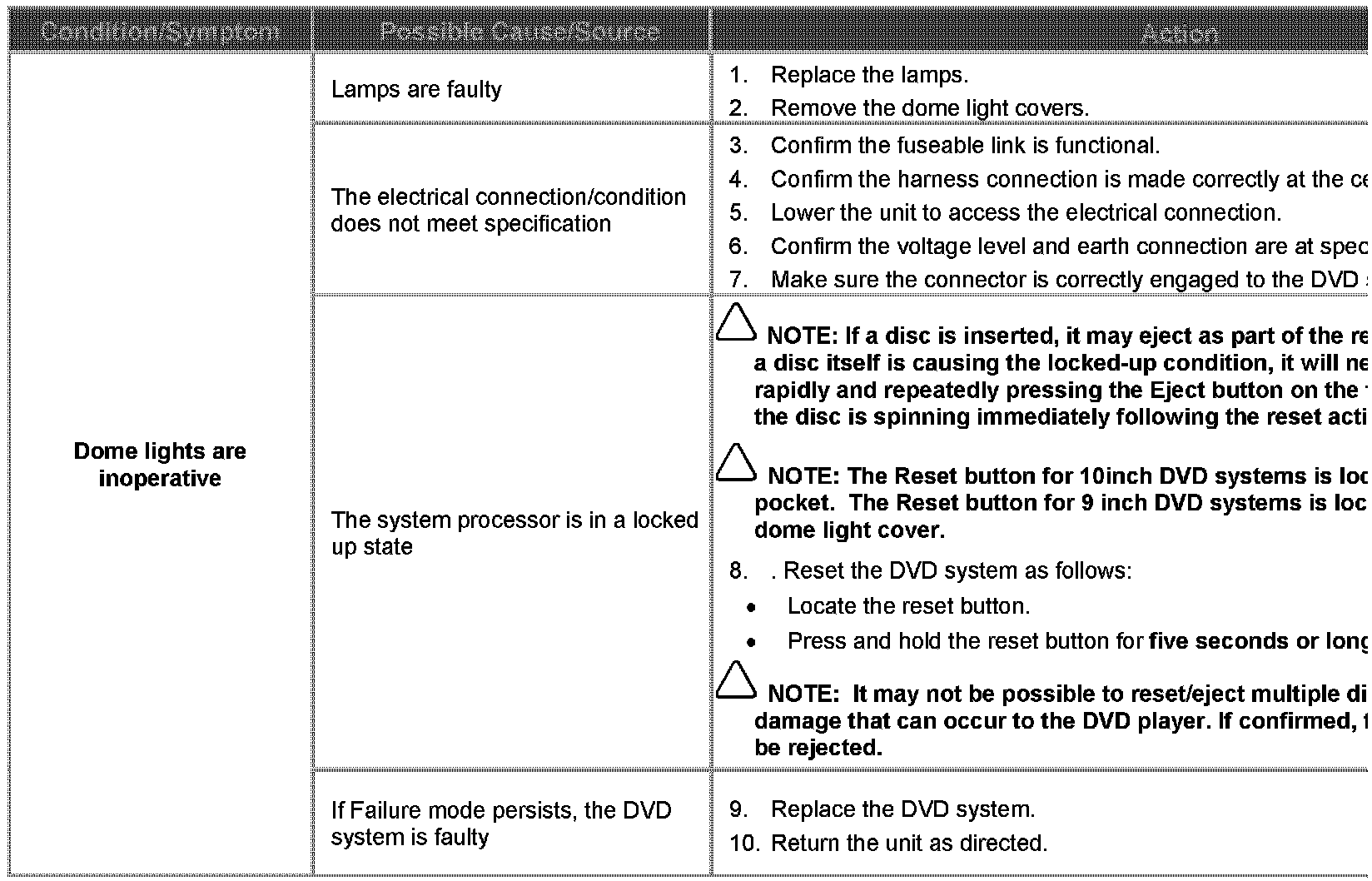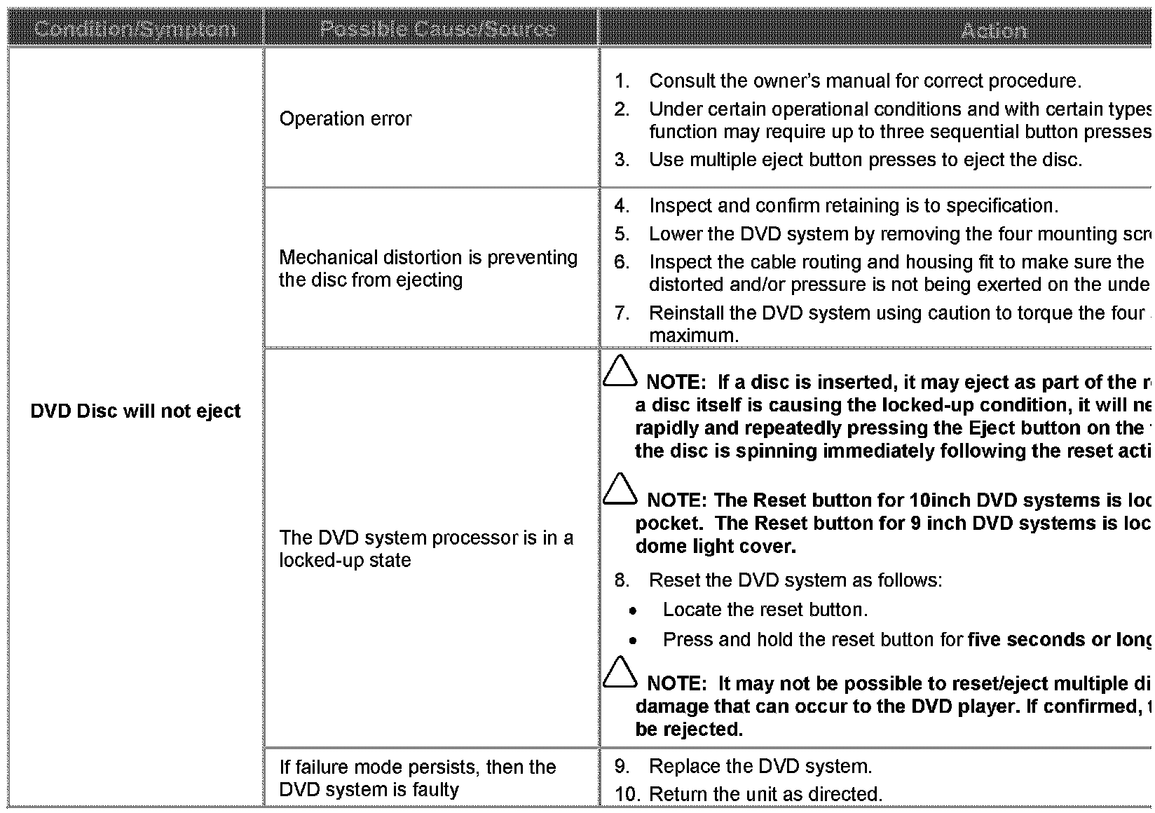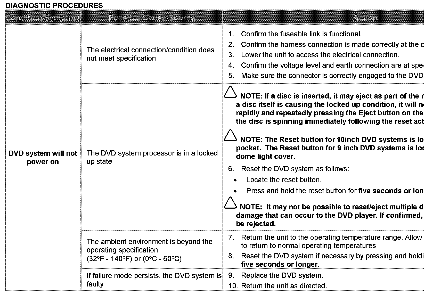 A range of software and hardware issues within the DVD system contribute to difficulty in diagnosis of system faults. The concerns are: failing in use, locking up, refusal to load discs, ejecting/sticking discs, distorted picture. This Technical Bulletin has been issued to supply a Diagnostic Procedure for accessory-installed DVD systems.