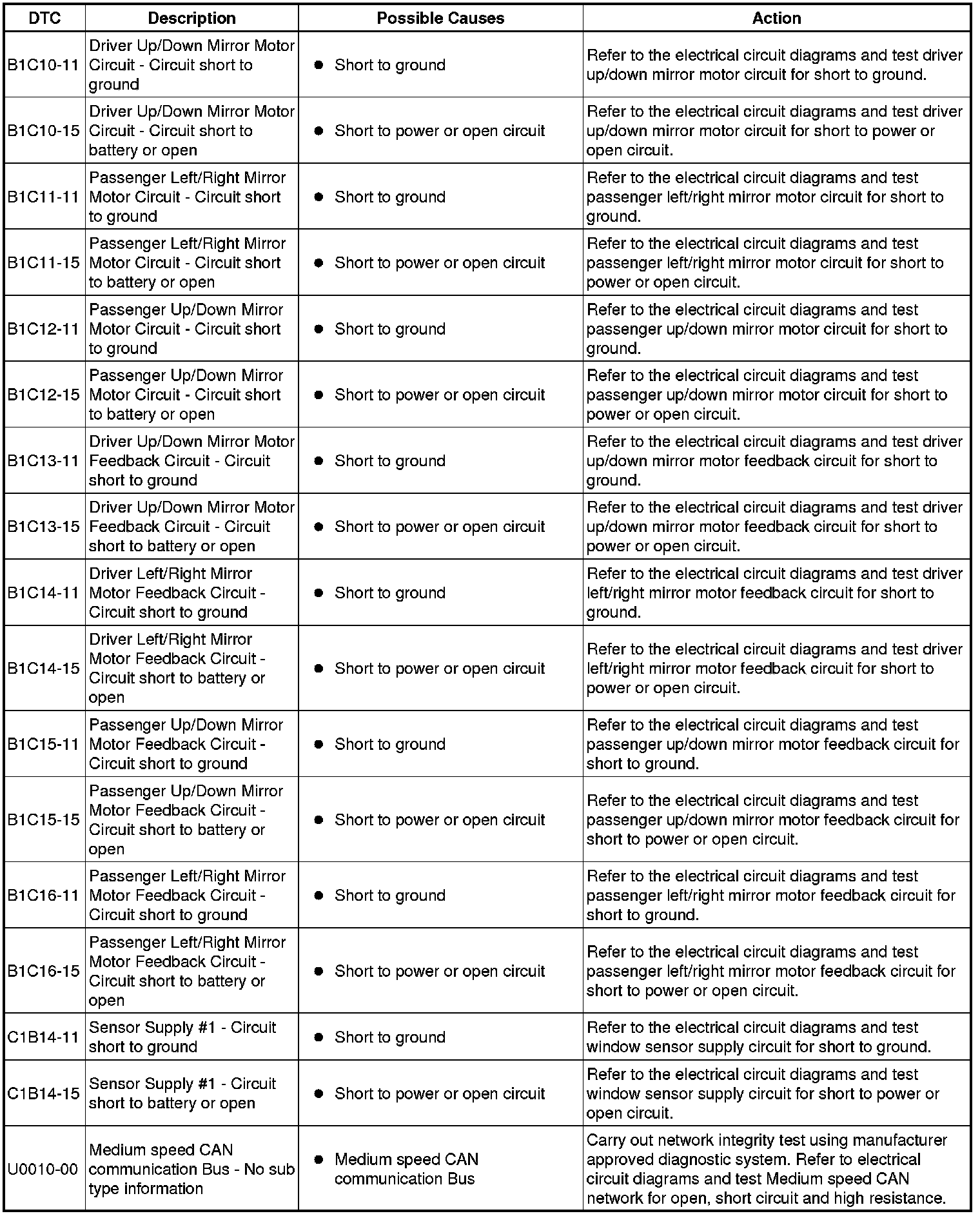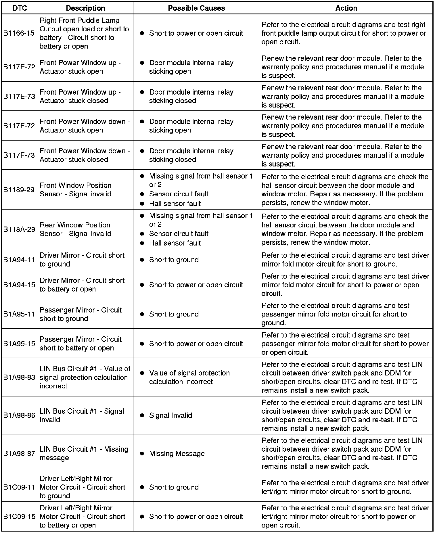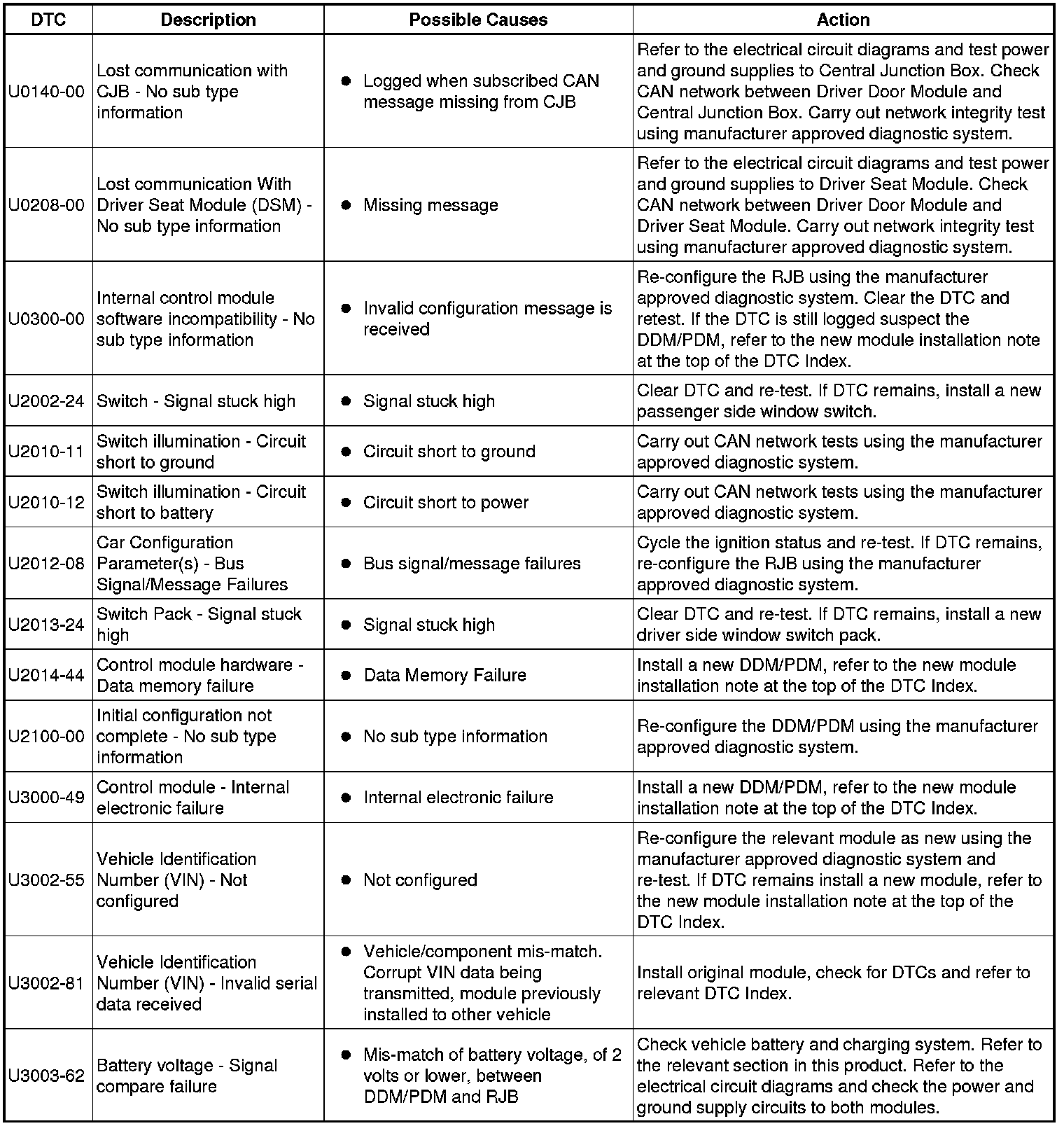 The table below lists all Diagnostic Trouble Codes (DTCs) that could be logged in the Driver Door Module, for additional Diagnosis and Testing information refer to the relevant Diagnosis and Testing Section.