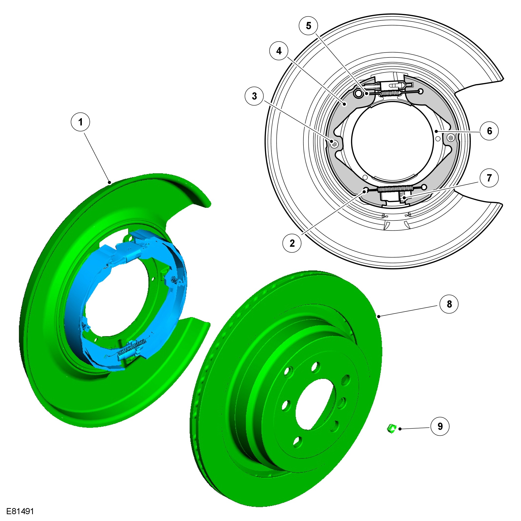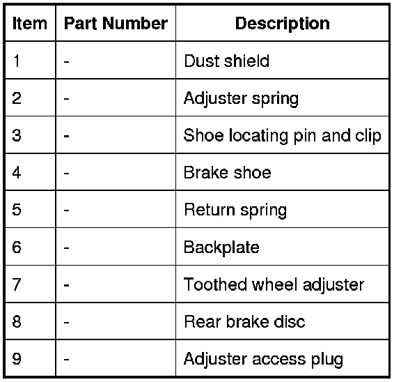 When the parking brake module tensions the brake cables, the movement is transmitted to an expander, which acts on both brake shoes. Brake shoe to drum clearance is set with a manual adjuster, which is accessed through a hole in the brake disc. The adjuster is a conventional toothed wheel adjuster.