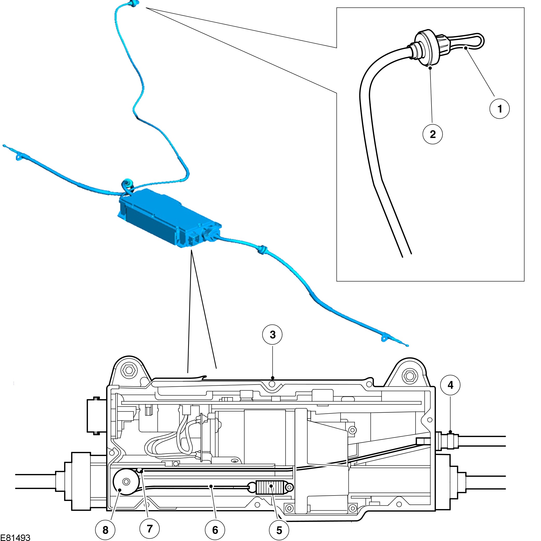 The emergency release cable is a Bowden cable installed between the parking brake module and the luggage compartment. In the luggage compartment, a pull ring is installed on the end of the inner cable. The pull ring is designed to fit the hook on the end of the jack handle , and when used in combination with a screwdriver shaft, can be used to pull on the cable.