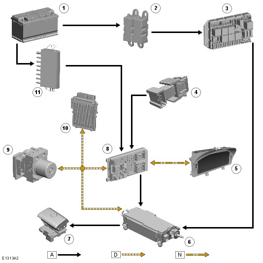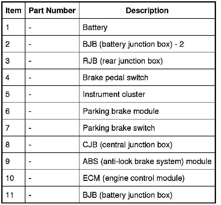 The parking brake module is powered by two permanent battery power feeds from the AJB (auxiliary junction box). A third connection with the CJB (central junction box) provides a battery voltage signal when the ignition switch is in position II (ignition). Other hardwired inputs include those from the parking brake switch.