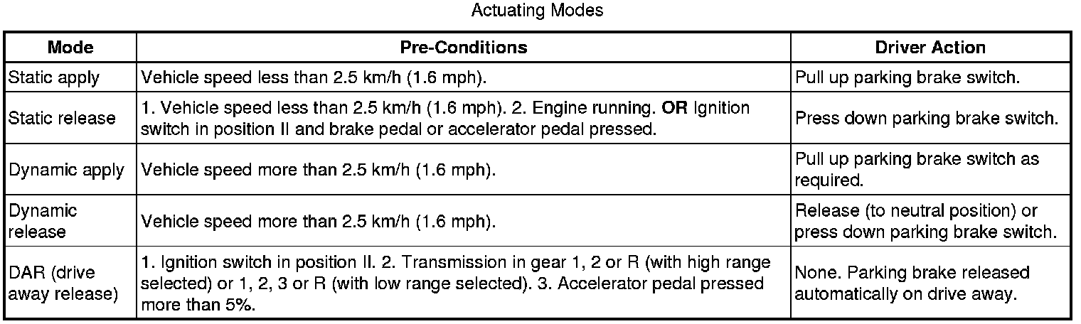 The parking brake can be applied at any time provided sufficient battery power is available. For the parking brake to be released, various pre-conditions are required. The parking brake has manual and automatic actuating modes, to cater for different operating circumstances, as detailed in the following table: