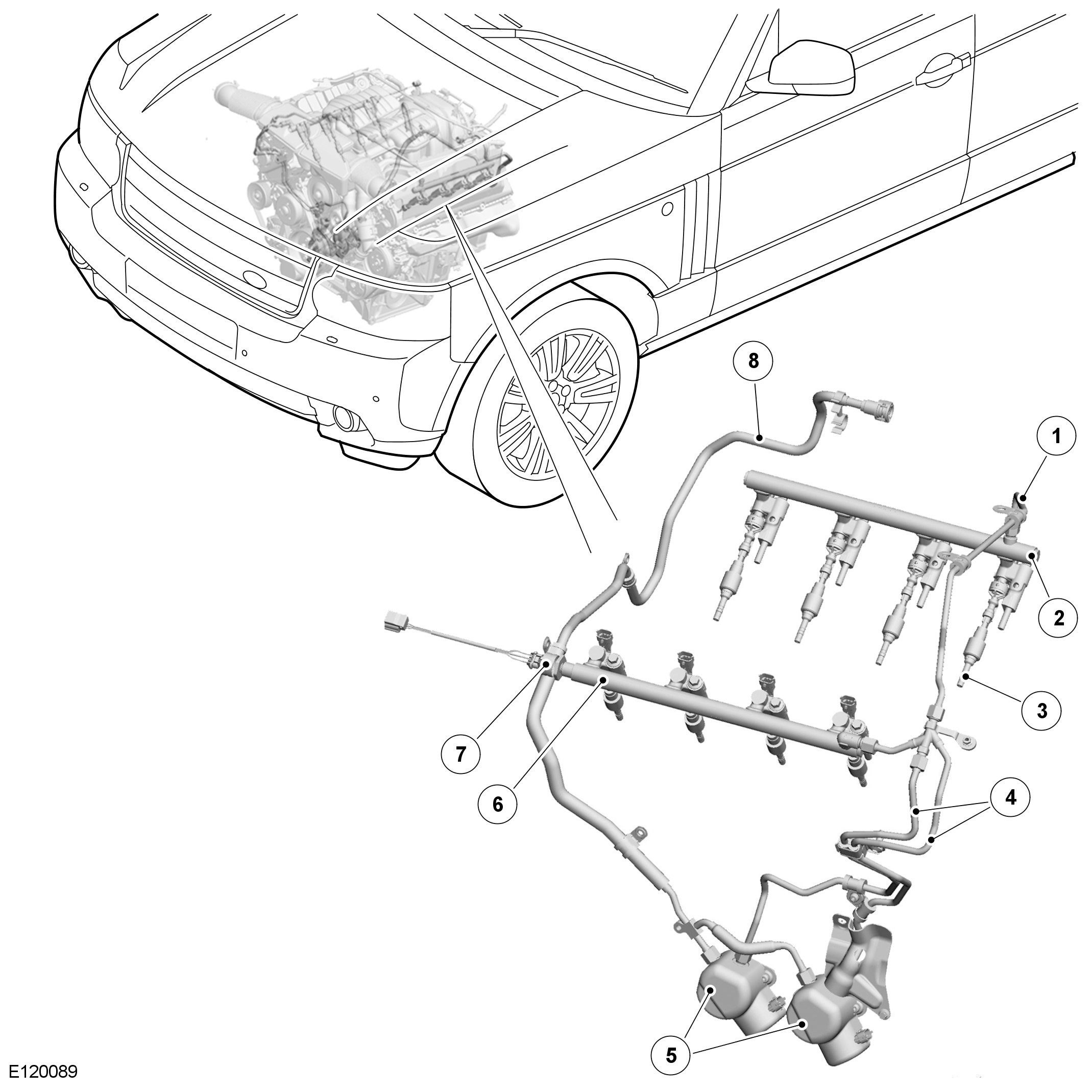 The LP fuel line connects the HP fuel pumps to the fuel delivery line from the fuel tank and lines system. A quick release connector at the start of the LP fuel line is held in a clip integrated into the LH (left-hand) ignition coils cover. P-clips secure the LP fuel line to the rear of each cylinder head and to the RH (right-hand) side of the cylinder block. A heat reflective and insulation sleeves are installed on the LP fuel line where it runs behind the RH (right-hand) exhaust manifold.