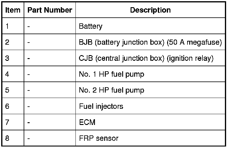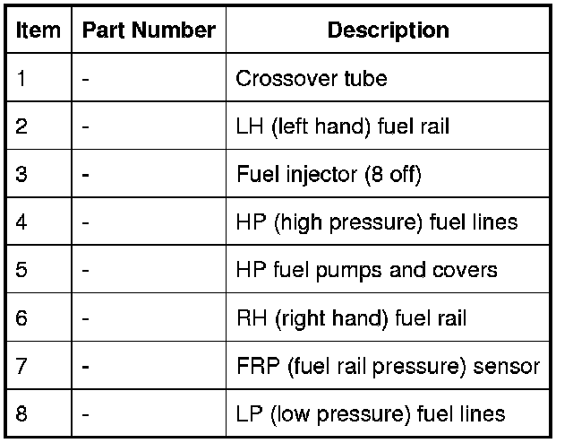 LP fuel from the pump in the fuel tank is pressurized by the HP fuel pumps and supplied to the fuel injectors via the fuel rails and crossover tube. The ECM (engine control module) controls the fuel injectors and HP fuel pumps to inject the required volume of fuel into the combustion chambers.