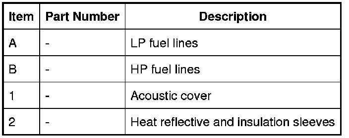 The HP fuel lines connect the HP fuel pumps to the RH (right-hand) fuel rail and the crossover tube. Two P-clips and a pipe clamp attach the HP fuel lines to the cylinder block and the RH (right-hand) cylinder head respectively. An integral bracket on the front HP fuel line is attached to a stud on the front-upper RH (right-hand) timing cover. An acoustic cover is installed on the bottom of the front HP fuel line.