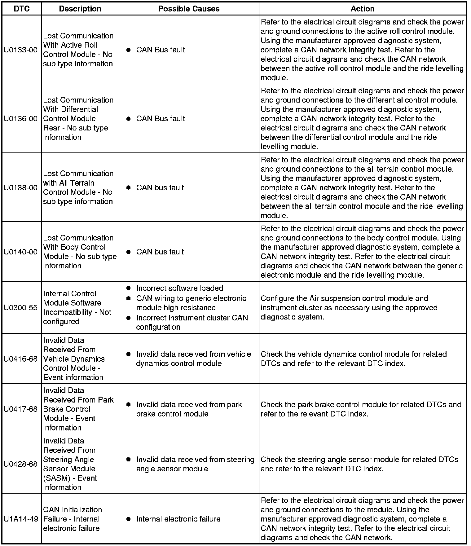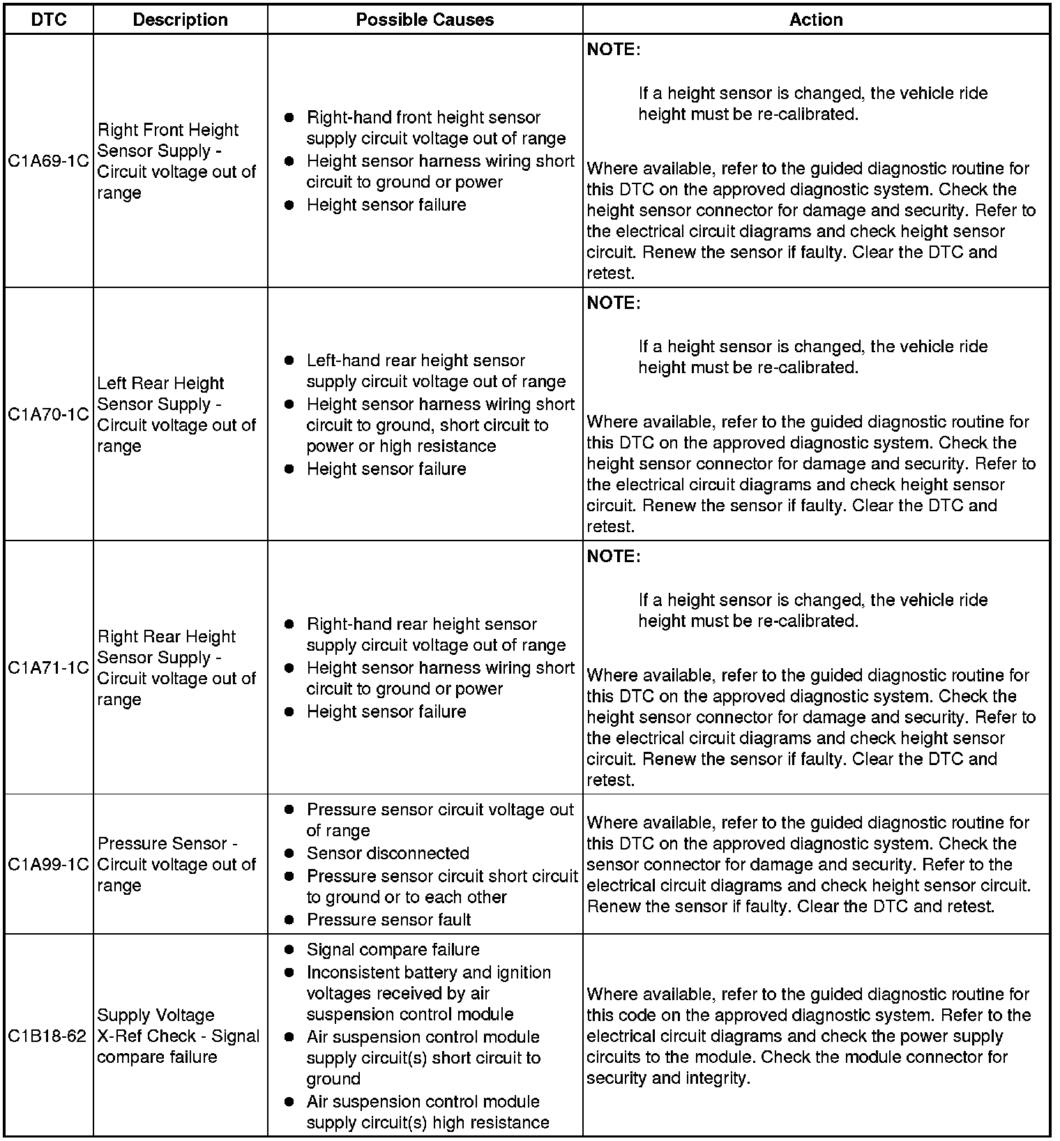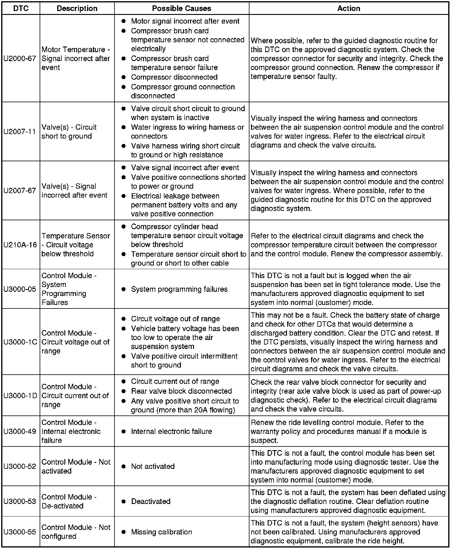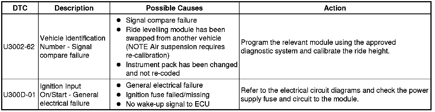The table below lists all Diagnostic Trouble Codes (DTCs) that could be logged in the Air Suspension Control Module, for additional Diagnosis and Testing information refer to the relevant Diagnosis and Testing Section. For additional information, refer to Vehicle Dynamic Suspension